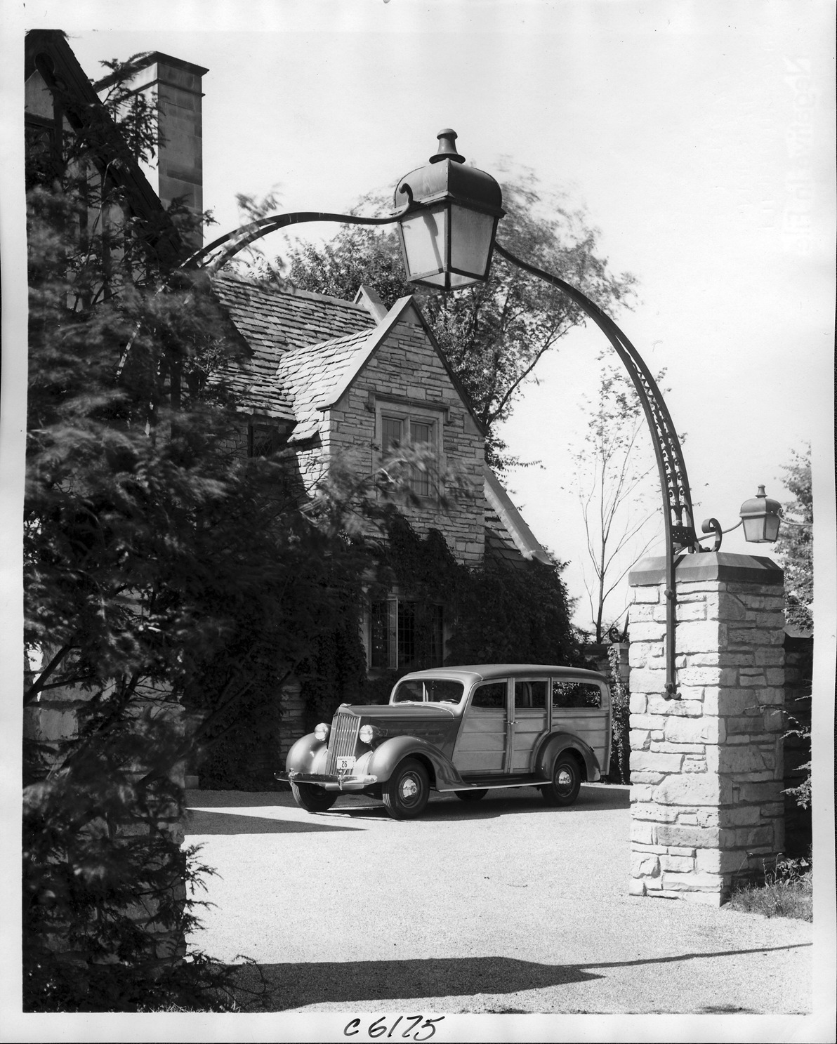 Packard Co. file photograph of a 1937 Packard three-quarter front view, parked in driveway of home. Inscribed on photo back: "Packard six, fifteenth series, model 115-C, 6-cylinder, 100-horsepower, 115-inch wheelbase, station wagon (body type #1060), prototype, setting: residence of Alvan Macauley, Grosse Pointe, Mich."