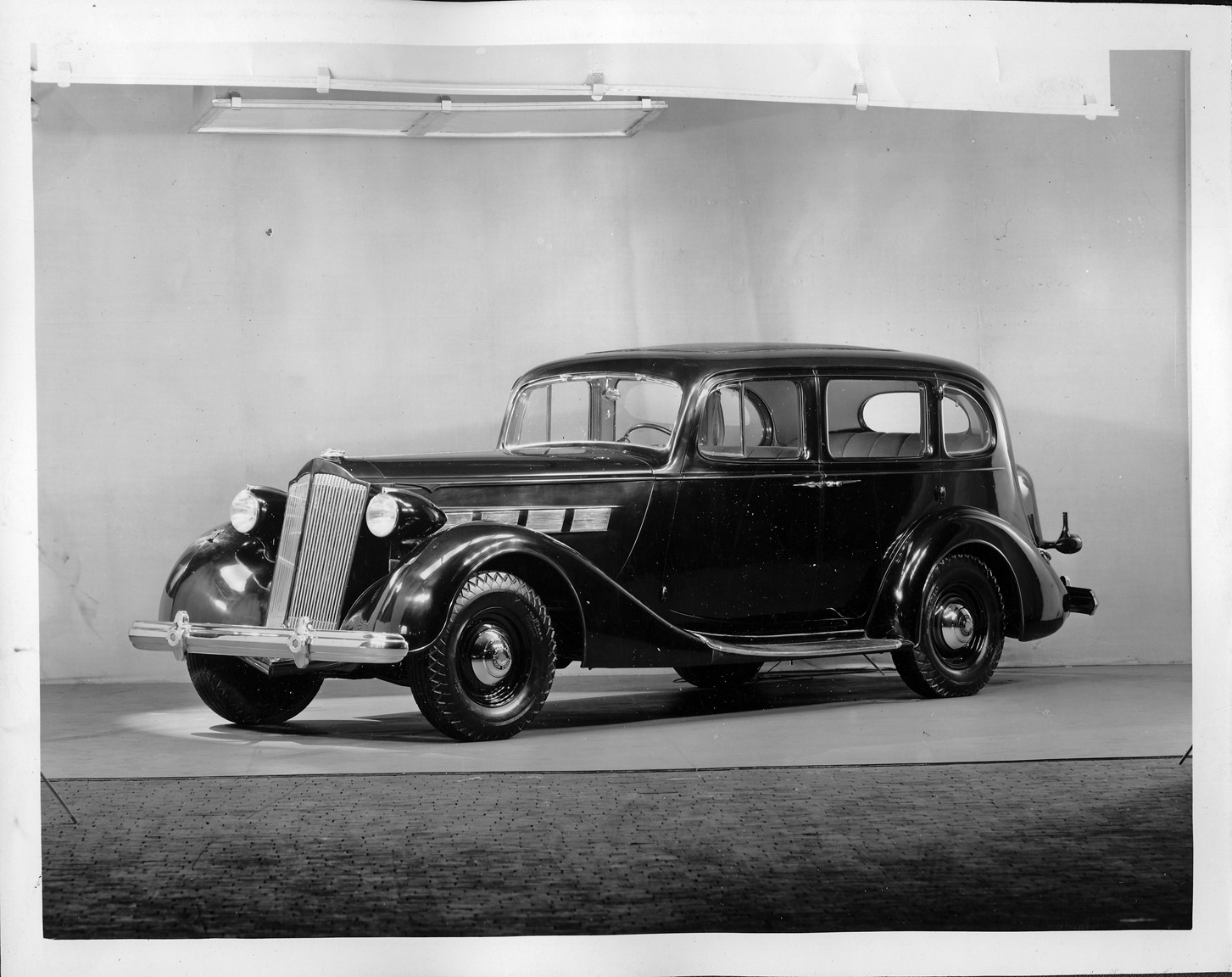 Packard Co. file photograph of a 1937 Packard three-quarter front view. Inscribed on photo back: "Packard super eight, fifteenth series, model 1500, 8-cylinder, 135-horsepower, 127-inch wheelbase, 5-person touring sedan (body type #1003), note proposed/rejected "senior Eight" hub caps, as shown, windshield wipers point left in "off" position, pointed right on production cars."