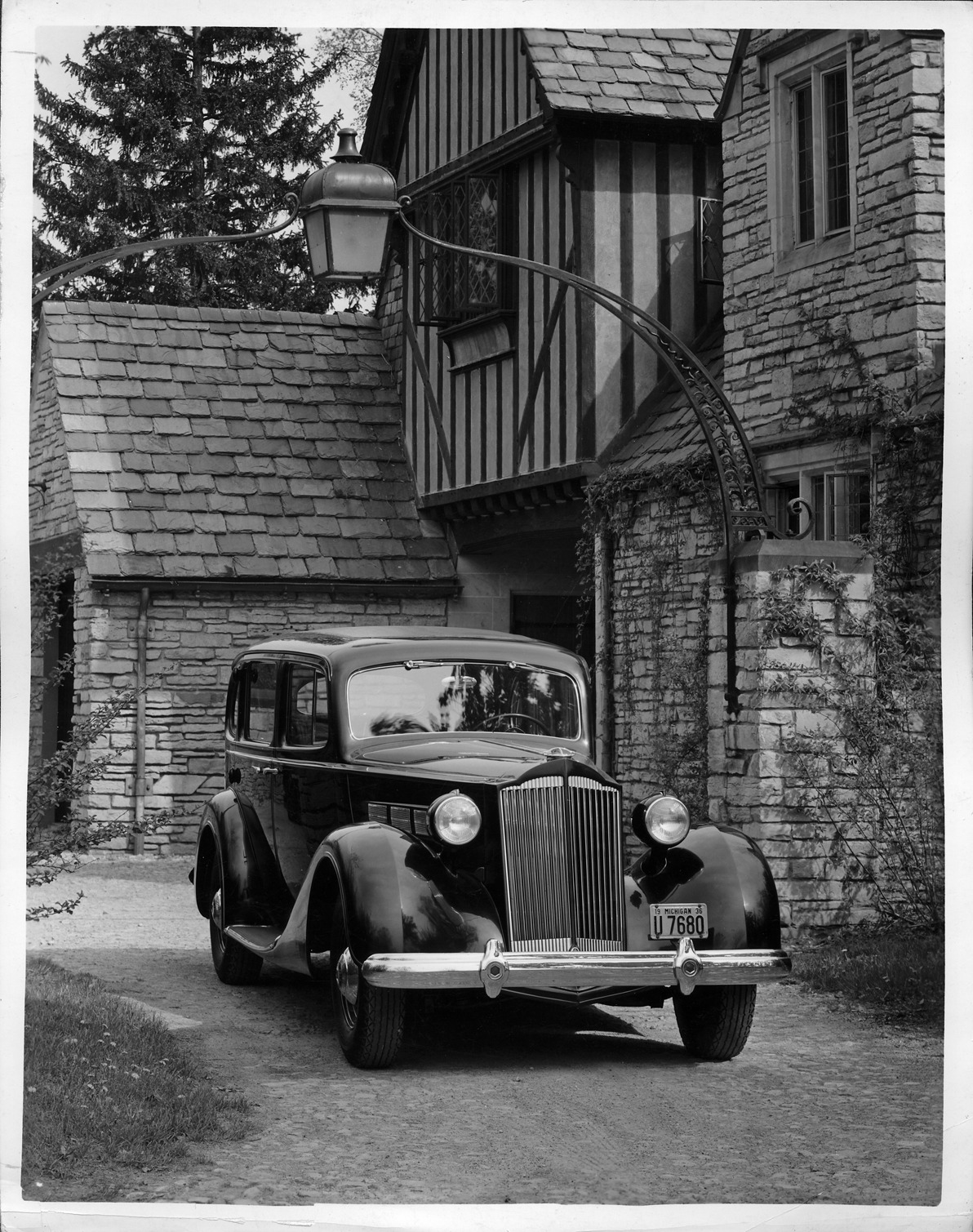 Packard Co. file photograph of a 1937 Packard three-quarter front view, parked in driveway of home. Inscribed on photo back: "Packard super eight, fifteenth series, model 1500, 8-cylinder, 135-horsepower, 127-inch wheelbase, 5-person touring sedan (body type #1003), note 1936 Michigan license plate #U7680, proposed/rejected "senior Eight" hub caps, as shown, windshield wipers point left in "off" position, pointed right on production cars, setting: residence Grosse Pointe, Mich."