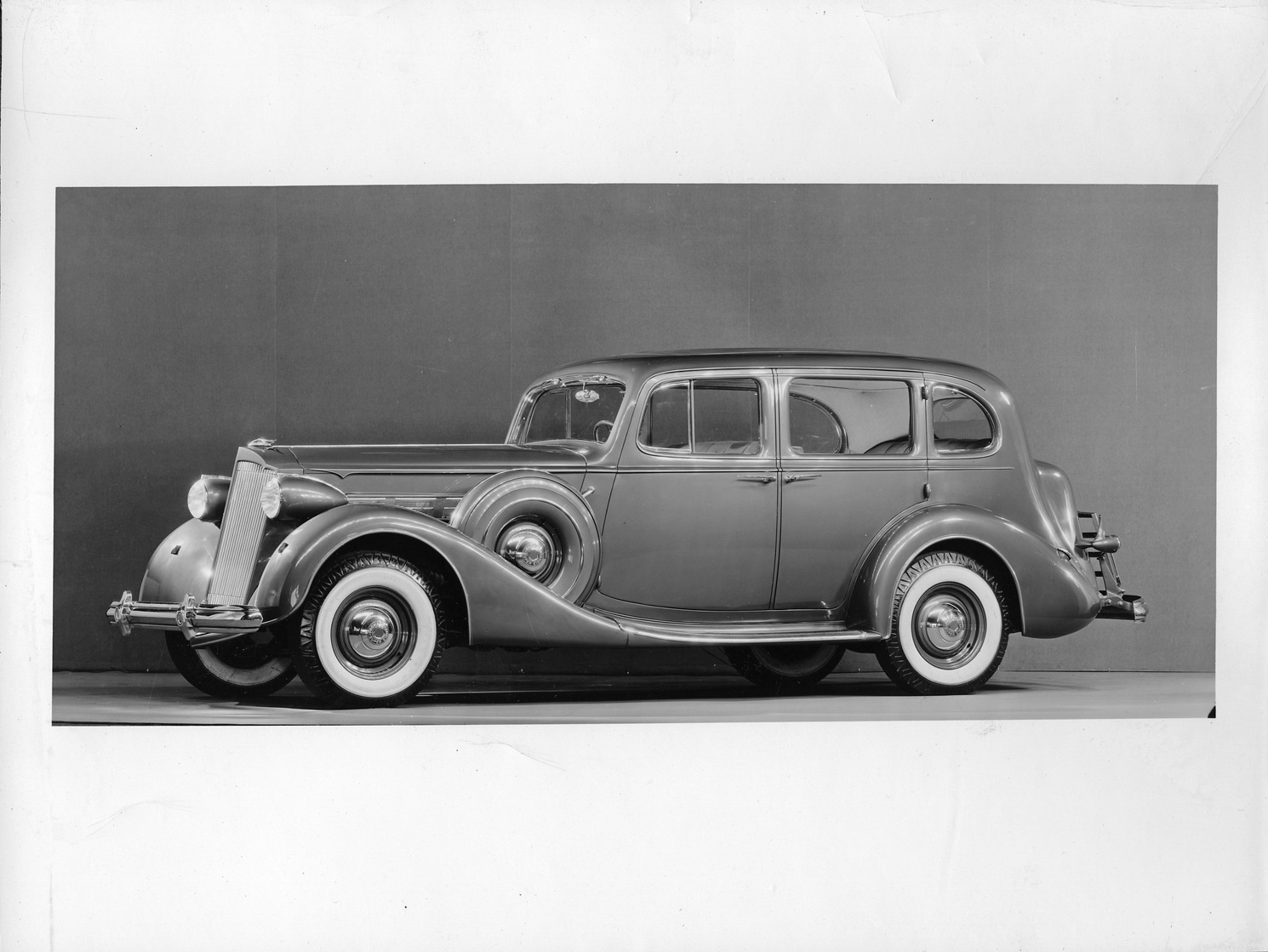Packard Co. file photograph of a 1937 Packard seven-eights left side view. Inscribed on photo back: "Packard super eight, fifteenth series, model 1500, 8-cylinder, 135-horsepower, 127-inch wheelbase, 5-person touring sedan (body type #1003)."