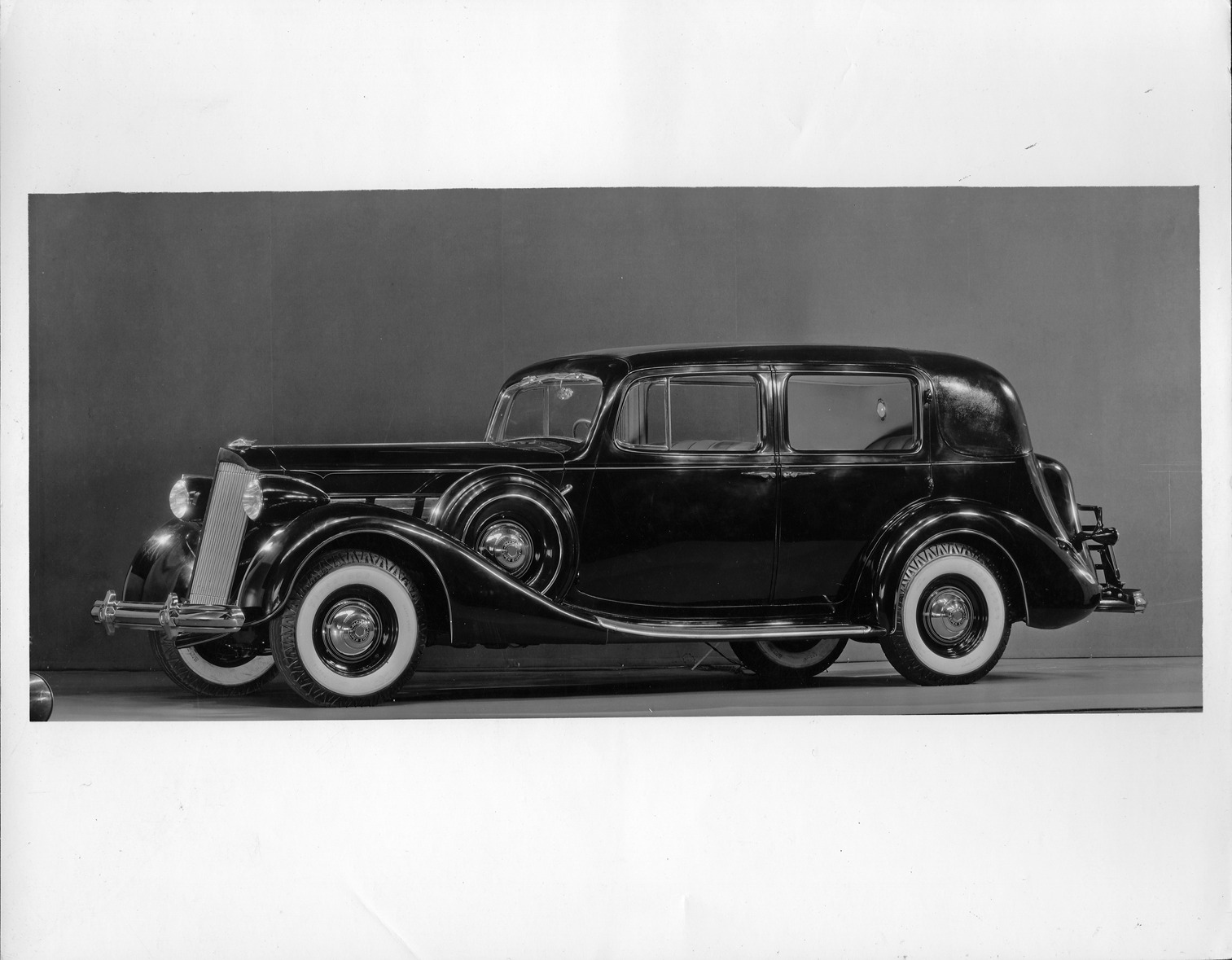 Packard Co. file photograph of a 1937 Packard nine-tenths left side view. Inscribed on photo back: "Packard super eight, fifteenth series, model 1501, 8-cylinder, 135-brakehorsepower, 134.375-inch wheelbase, 5/7-person formal sedan (body type #1012)."