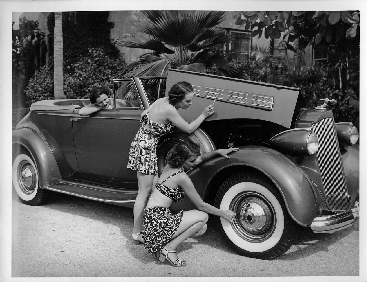 Packard Co. file photograph of a 1937 Packard three-quarter right side view, hood partially open, two females in bathing suits at front, one female in passenger seat. Inscribed on photo back: "Packard super eight, fifteenth series, model 1501, 8-cylinder, 135-horsepower, 134-inch wheelbase, 5-person convertible victoria (body type #1007), note white sidewall tires, fender wells, 6-wheels, trunk rack (not see in photograph), Packard deluxe emblem, setting: Florida."