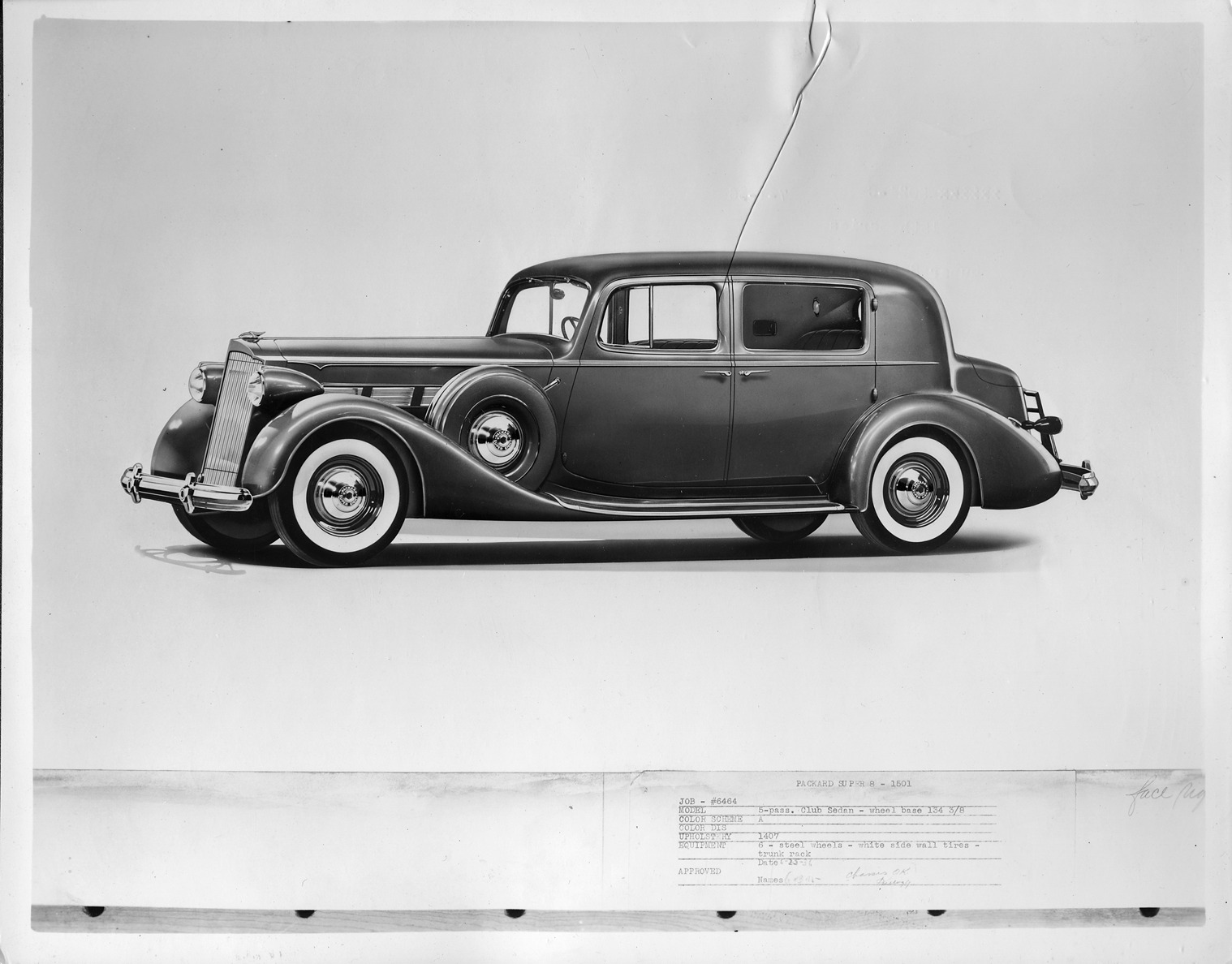 Packard Co. file photograph of a 1937 Packard nine-tenths left side view. Inscribed on photo back: "Packard super eight, fifteenth series, model 1501, 8-cylinder, 135-horsepower, 134.375-inch wheelbase, 5-person club sedan (body type #1016)."