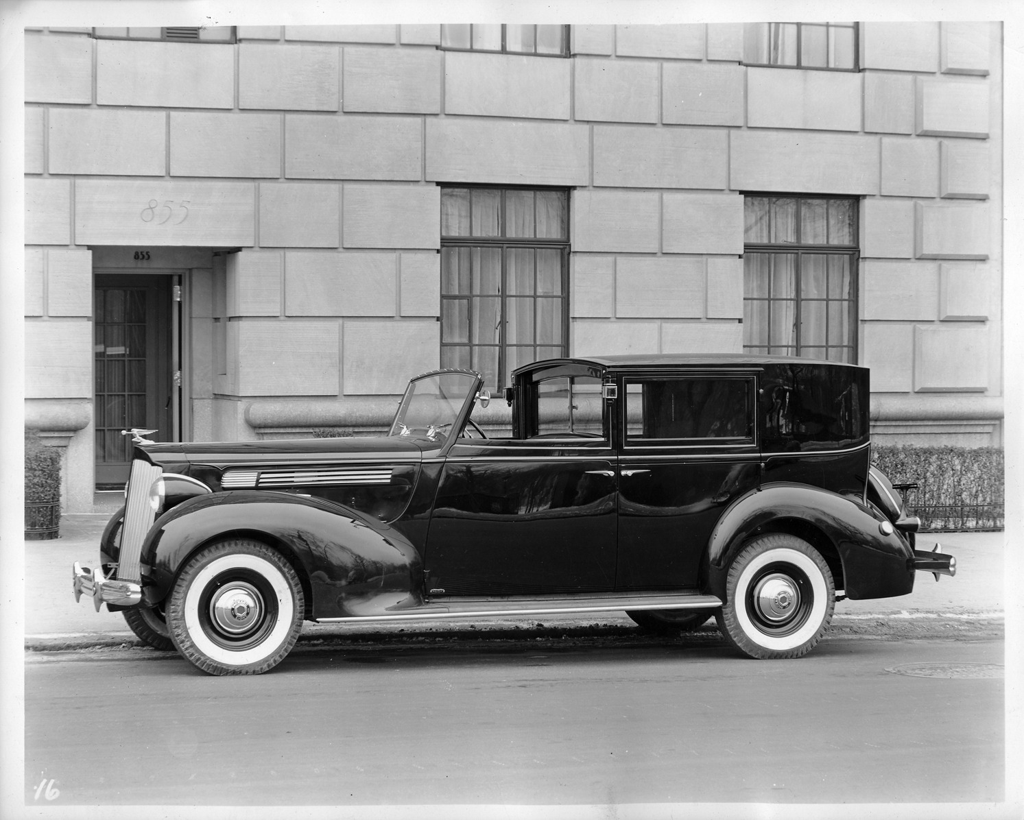 Packard Co. file photograph of a 1938 Packard left side view, parked on street. Inscribed on photo back: "Packard eight, sixteenth series, model 1601, 8-cylinder, 120-horsepower, 127-inch wheelbase, 7-person all weather panel brougham (body type #1668), by Rollston."