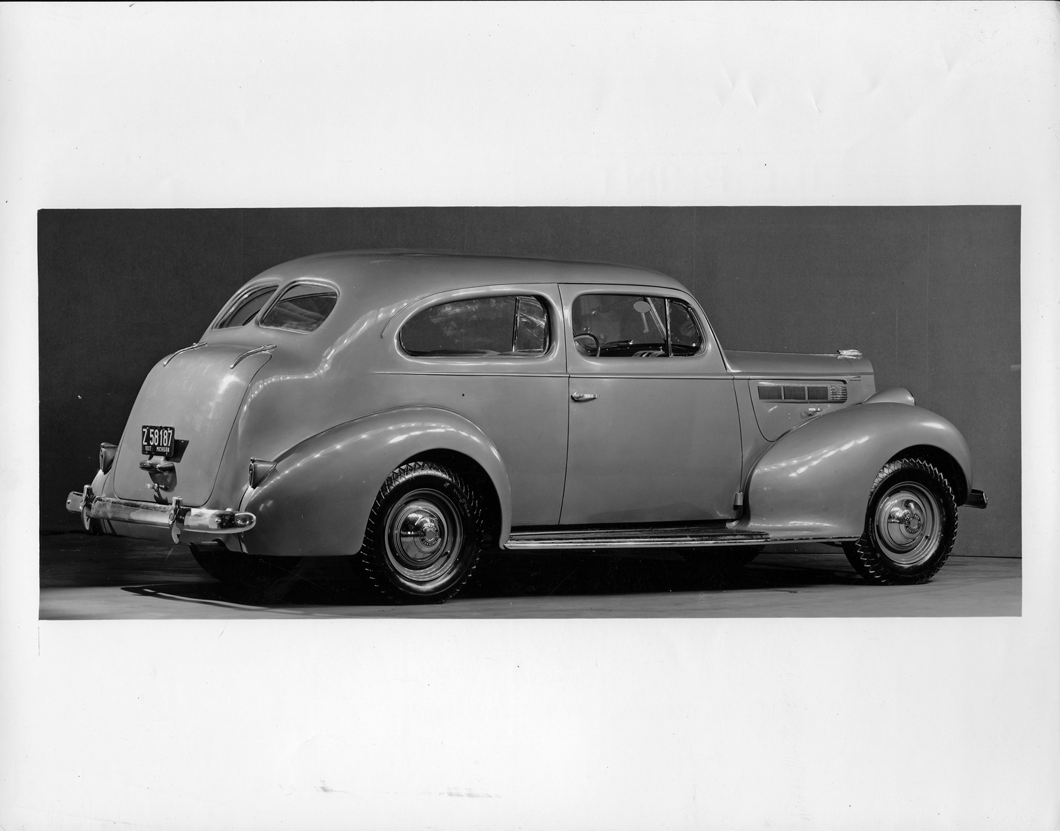 Favorite this☆ 1938 Packard touring sedan, seven-eights right rear view Description: Packard Co. file photograph of a 1938 Packard seven-eights right rear side view. Inscribed on photo back: "Packard six, sixteenth series, model 1600, 6-cylinder, 100-horsepower, 122-inch wheelbase, 2-door, 5-person touring sedan (body type #1184), prototype, note 1937 Michigan license plate Z58187, pre-production (tear drop) tail lights." Details Resource ID: EB01e072 Creator: Packard Motor Car Company Subject: Packard automobile Photographic prints Date Issued: 1938 Format: 1 photographic print ; 8 x 10 in. Member of: National Automotive History Collection Packard Collection Rights: Physical rights are retained by DPL. Copyright is retained in accordance with U.S. copyright laws.