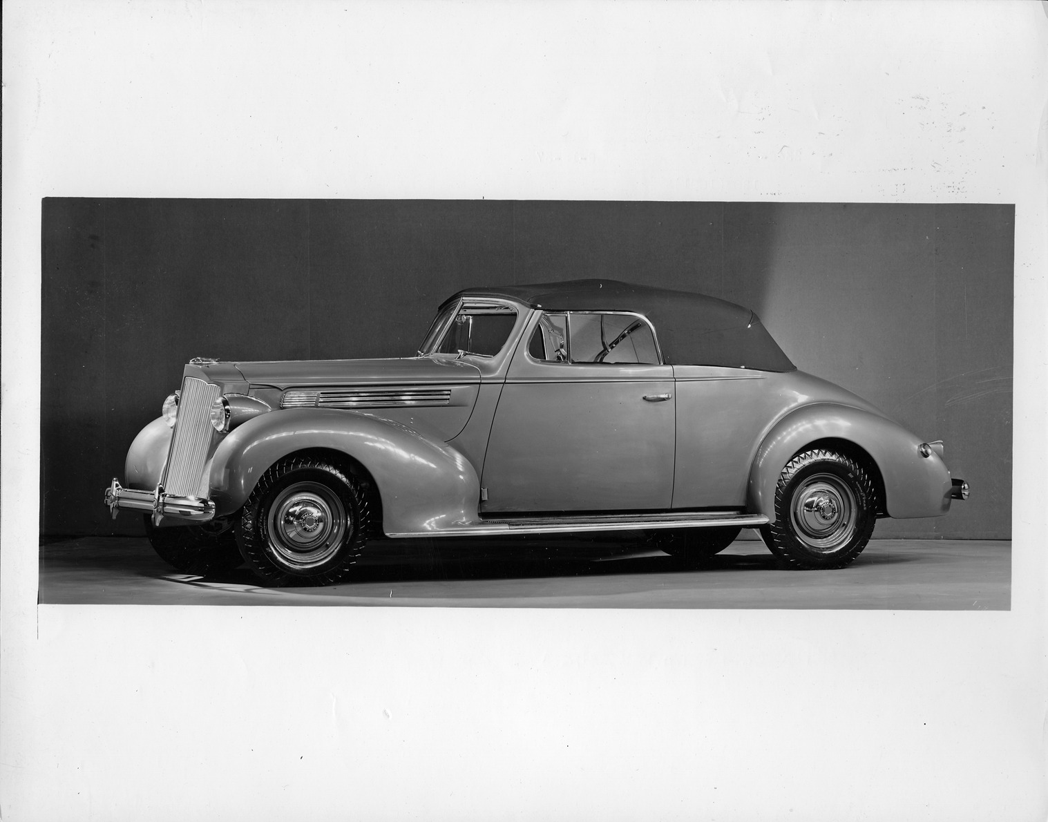 Packard Co. file photograph of a 1938 Packard seven-eights left side view, top raised. Inscribed on photo back: "Packard eight, sixteenth series, model 1601, 8-cylinder, 120-horsepower, 127-inch wheelbase, 2/4-person convertible coupe (body type #1199), prototype, note non-production "one twenty" hub caps, non-production bumper guards, non-production bumper (painted center band)."