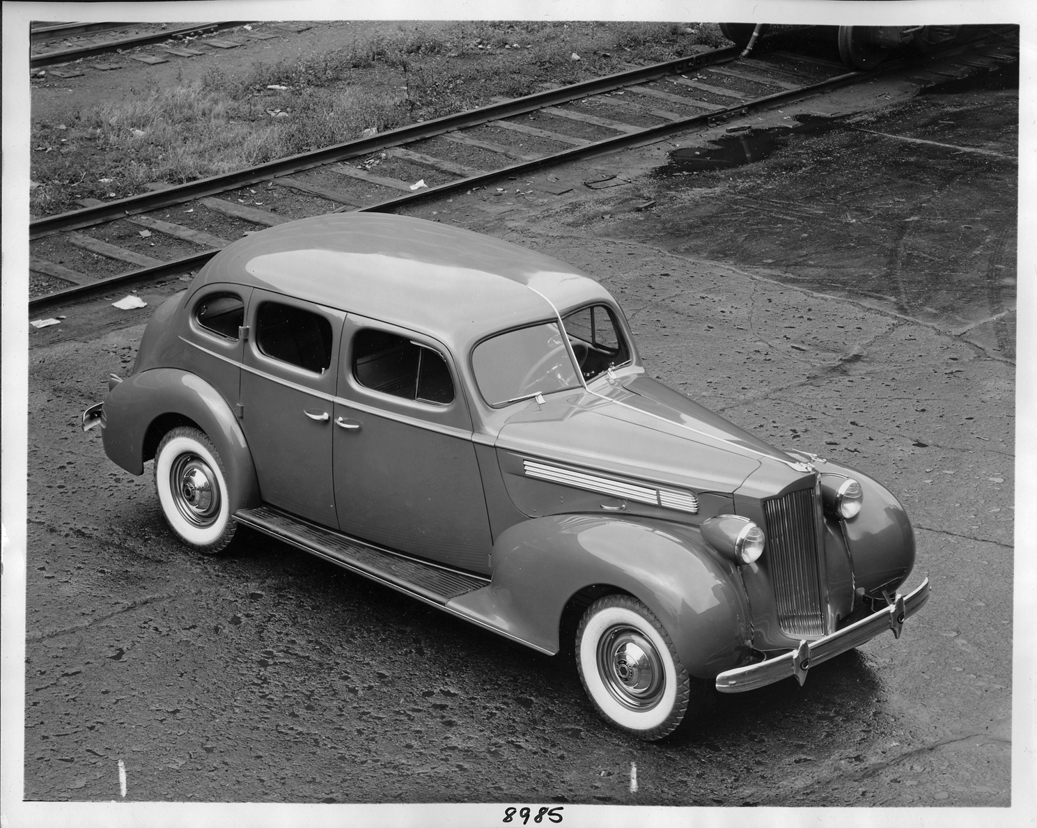 Packard Co. file photograph of a 1938 Packard, nine-tenths elevation right side view, parked near railroad tracks. Inscribed on photo back: "Packard eight, sixteenth series, model 1601-D, 8-cylinder, 120-horsepower, 127-inch wheelbase, 4-door, 5-person deluxe touring sedan (body type #1172), note white sidewall tires, wheel trim beauty rings, Packard deluxe emblem, deluxe steering wheel."