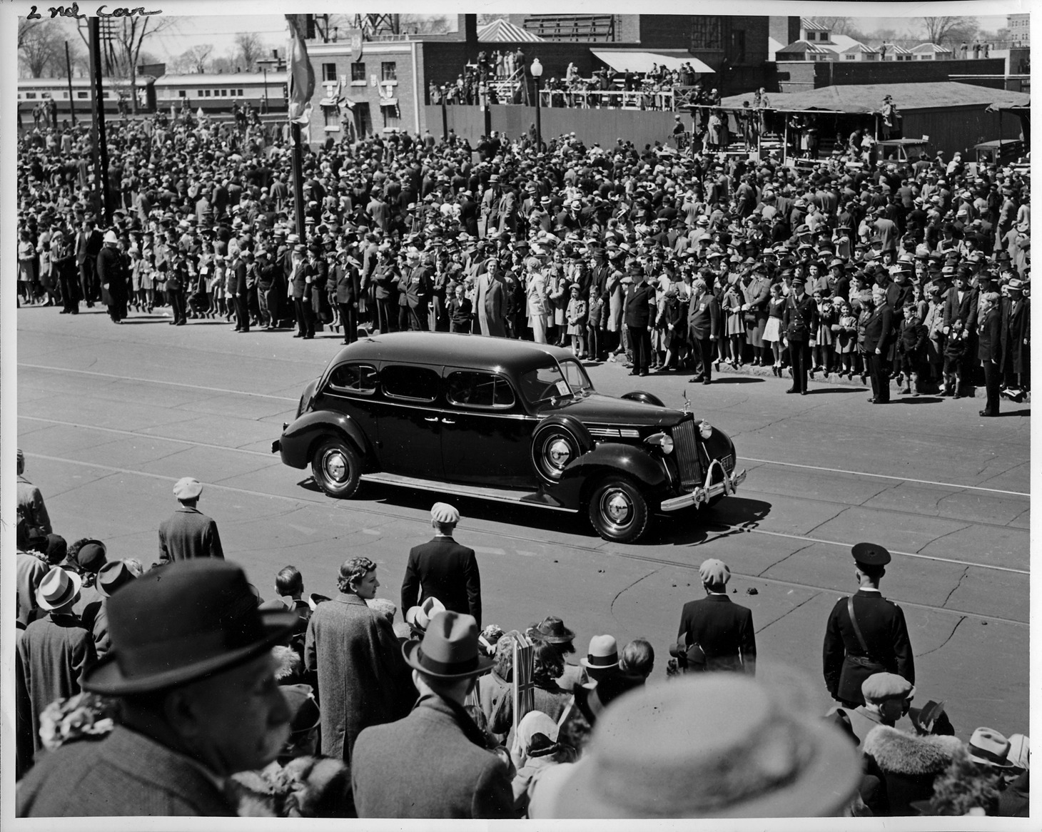 Packard Co. file photograph of a 1938 Packard seven-eights right side view, taken during reception parade for King George VI & Queen Elizabeth. Inscribed on photo back: "Packard eight, sixteenth series, model 1602, 8-cylinder, 120-horsepower, 148-inch wheelbase, 7-person touring limousine (body type #1191), note pelican emblem, license plate frame, non-standard bumper guards, fender wells, 6-wheels, wheel trim beauty rings, deluxe steering wheel, twelfth car in reception parade for King George VI & Queen Elizabeth, state visit to Canada, spring 1939 Montreal."