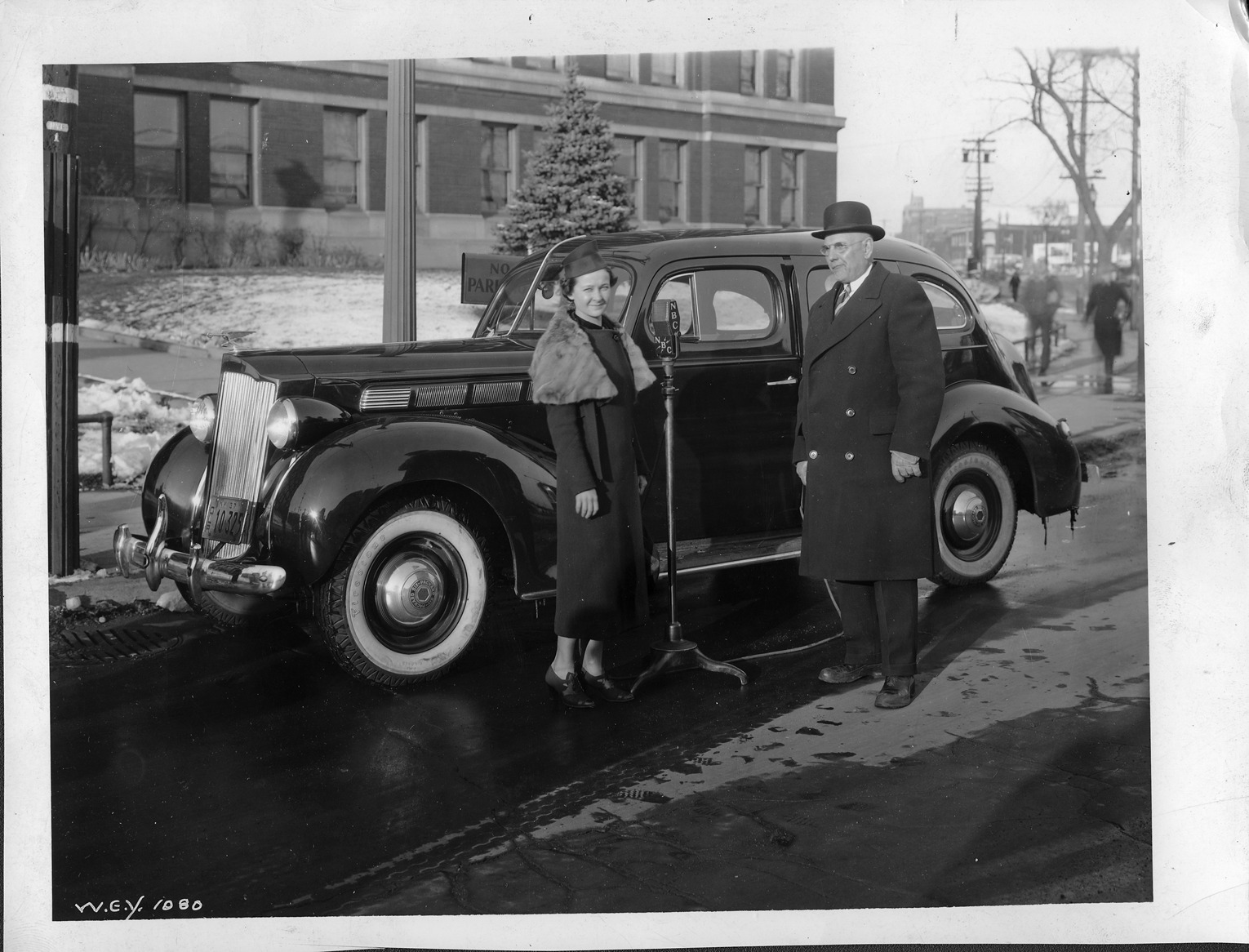 Packard Co. file photograph of a 1938 Packard nine-tenths left side view, woman standing at microphone, man standing on other side of microphone. Inscribed on photo back: "Packard six, sixteenth series, model 1600, 6-cylinder, 100-horsepower, 122-inch wheelbase, 4-door, 5-person touring sedan (body type #1182), note 1937 New York dealer plate #DLR10-235, license plate frame, center bumper guard, Packard deluxe emblem, dual white sidewall tires, standing by NBC microphone : Hazel B. Cooper, 4th week winner in Packard contest."