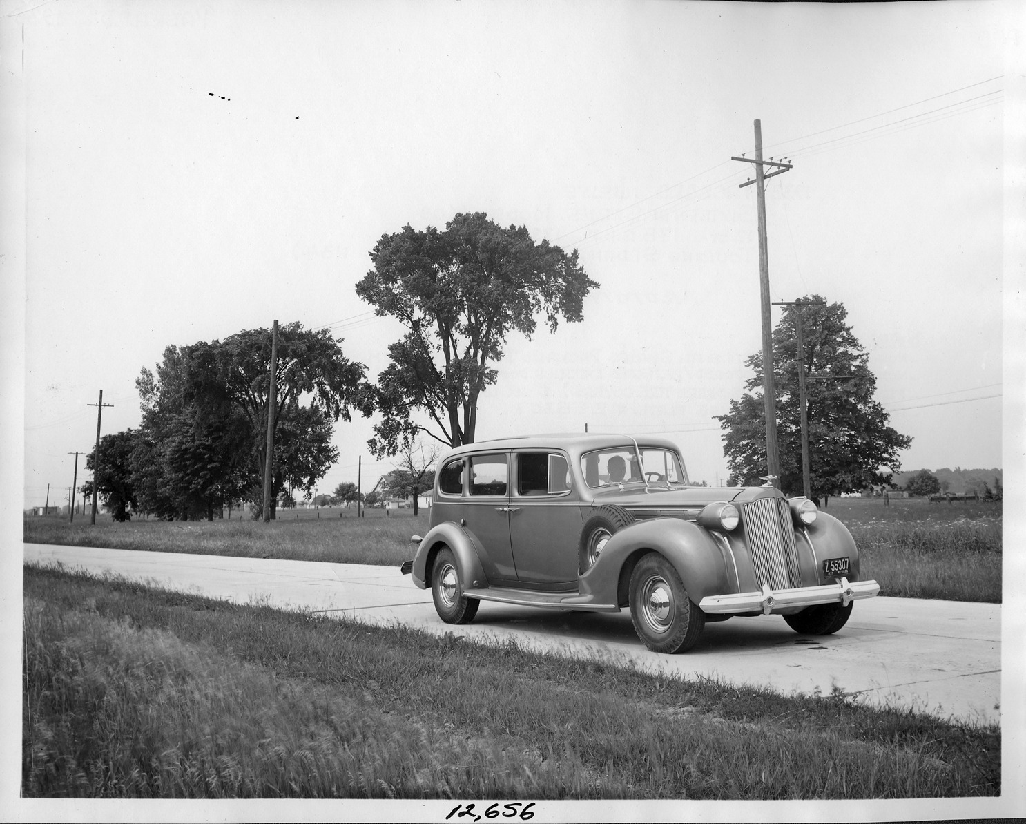 Favorite this☆ 1938 Packard touring sedan, seven-eights front view, on drive, male driver Description: Packard Co. file photograph of two 1938 Packard seven-eights front view, on drive, male driver. Inscribed on photo back: "Left; Packard twelve, sixteenth series, model 1608, 12-cylinder, 175-horsepower, 139.375-inch wheelbase, 7-person touring sedan (body type #1134), prototype, note non-production fifteenth series Packard deluxe emblem, non-production proposed/rejected exterior door handle styling, fender wells (sans spare tire covers) & 6-wheels, 1937 Michigan license plate #Z55307." Details Resource ID: EB01e100 Creator: Packard Motor Car Company Subject: Packard automobile Photographic prints Date Issued: 1938 Format: 1 photographic print ; 8 x 10 in. Member of: National Automotive History Collection Packard Collection Rights: Physical rights are retained by DPL. Copyright is retained in accordance with U.S. copyright laws.