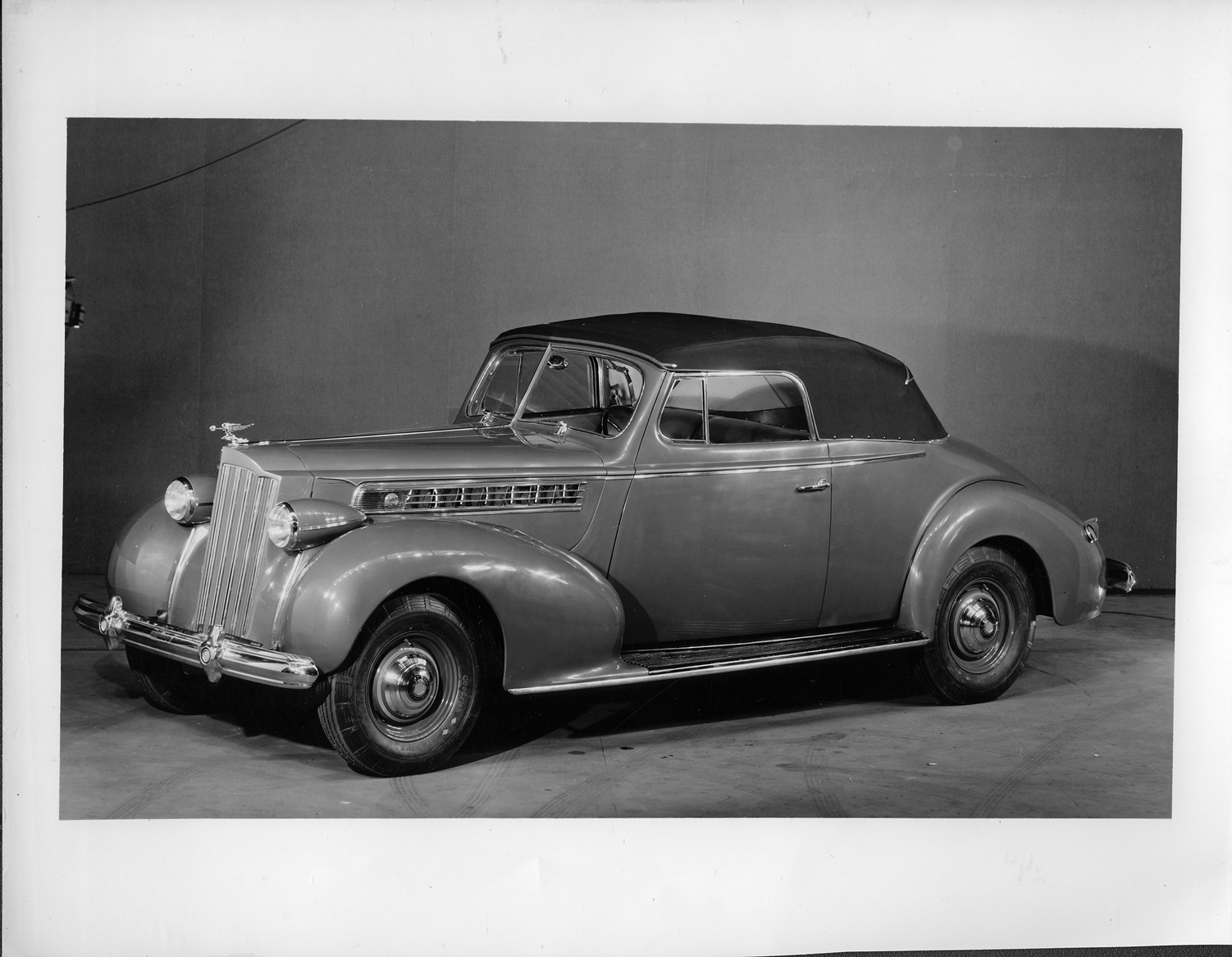 Packard Co. file photograph of a 1939 Packard seven-eights left side view, top raised. Inscribed on photo back: "Packard super eight, seventeenth series, model 1703, 8-cylinder, 130-horsepower, 127-inch wheelbase, 2/4-person convertible coupe (body type #1279), prototype, note left headlamp out of alignment, non-production sixteenth series style Packard deluxe emblem, non-production steering wheel, absent interior window garnish molding, non-production running board tread, non-production tail lamp housing & reflector a la sixteenth series "Junior" models."