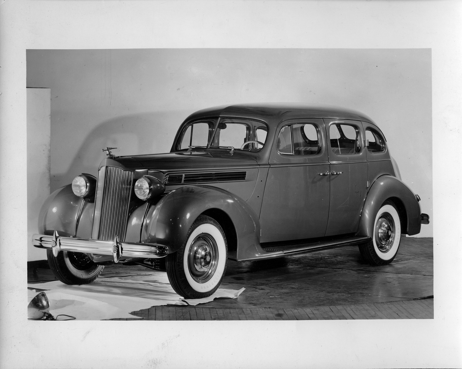 Packard Co. file photograph of a 1939 Packard three-quarter left front view. Inscribed on photo back: "Packard one twenty, seventeenth series, model 1701, 8-cylinder, 120-horsepower, 127-inch wheelbase, 4-door, 5-person touring sedan (body type #1292), note dual white sidewall tires, wheel trim beauty rings, Packard deluxe emblem, deluxe steering wheel, holes on left side panel ready to accept radio aerial mountings."