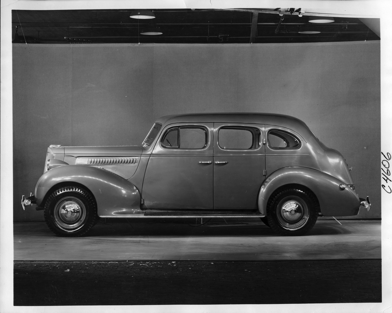 Packard Co. file photograph of a 1939 Packard left side view. Inscribed on photo back: "Packard six, seventeenth series, model 1700, 6-cylinder, 100-horsepower, 122-inch wheelbase, 4-door, 5-person touring sedan (body type #1282), prototype, note non-production hub caps, tail lamp, windshield wiper direction point (production blades pointed to center)."