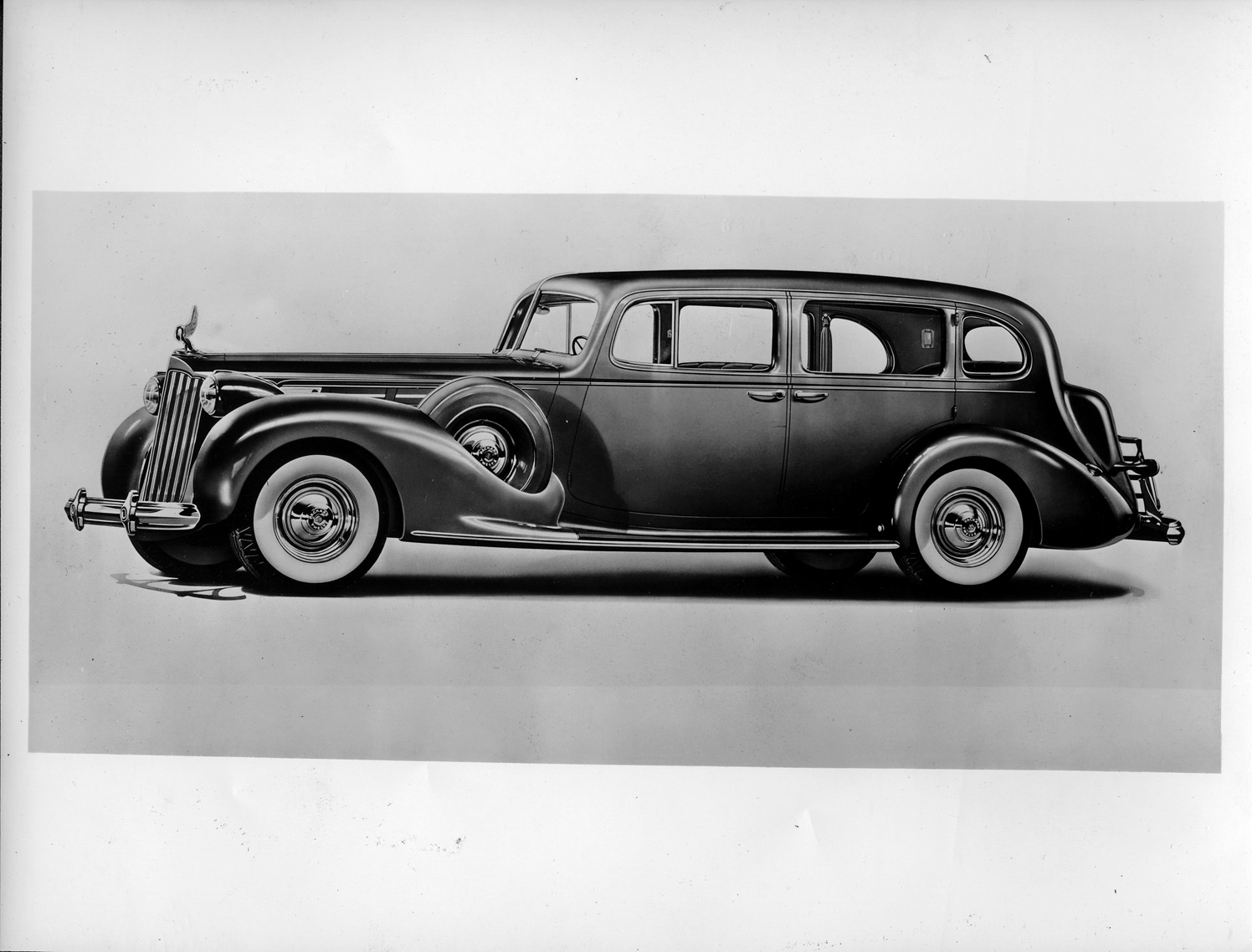 Packard Co. file photograph of a 1939 Packard nine-tenths left side view, top raised. Inscribed on photo back: "Packard twelve, seventeenth series, model 1707, 12-cylinder, 175-horsepower, 134-inch wheelbase, 5-person touring sedan (body type #1233), note wheel trim beauty rings, fender wells & 6-wheels, pelican emblem, dual white sidewall tires, trunk rack."