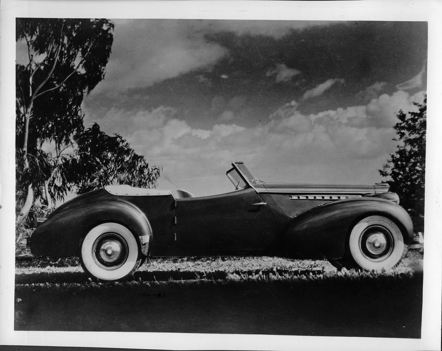 Packard Co. file photograph of a 1939 Packard right side view, top folded, parked on grass. Inscribed on photo back: "Packard super eight, seventeenth series, model 1703, 8-cylinder, 130-horsepower, 127-inch wheelbase, convertible victoria, by Darrin, note wheel trim beauty rings, vogue white sidewall tires."