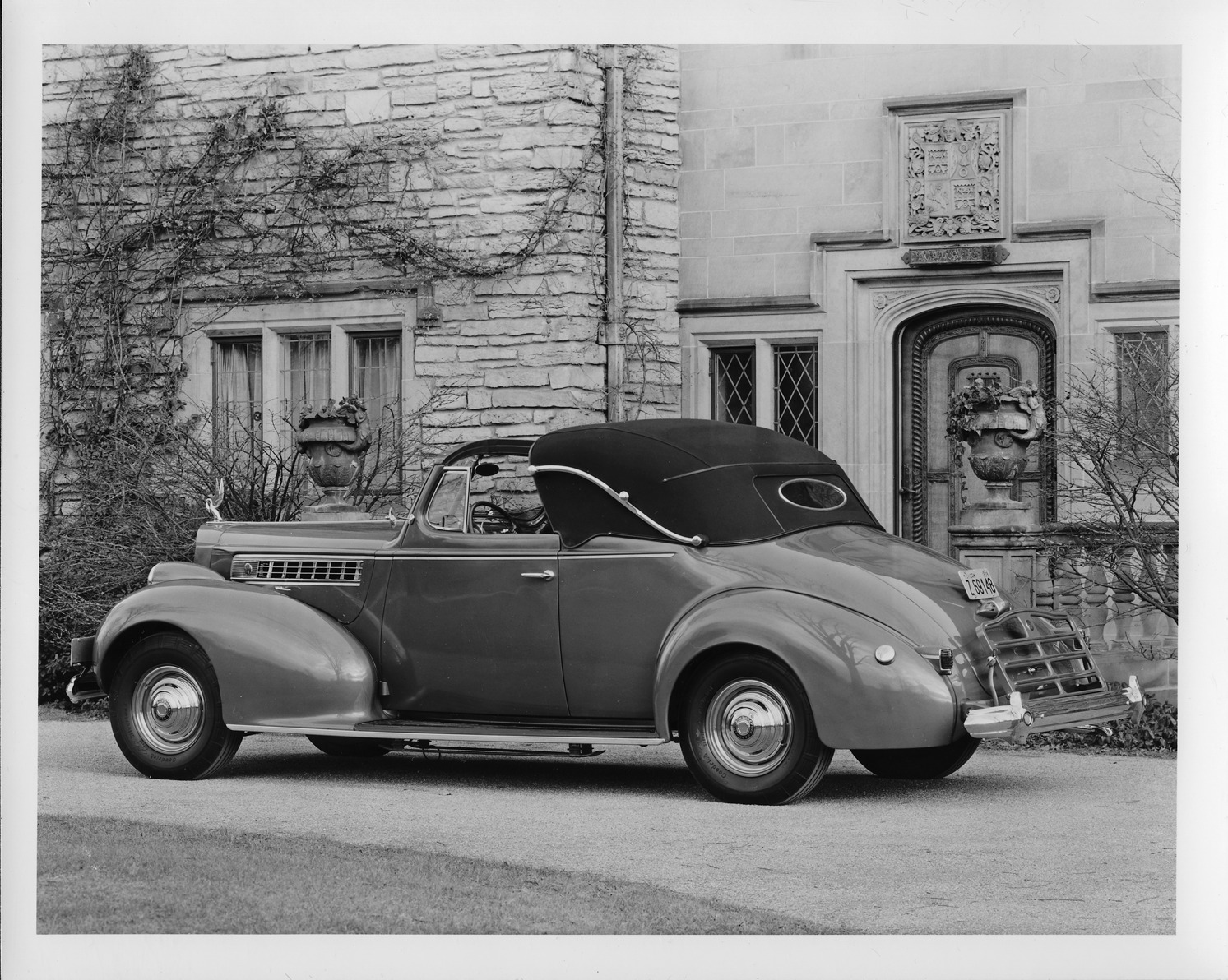 Packard Co. file photograph of a 1939 Packard three-quarter rear view, top raised, parked in driveway of home. Inscribed on photo back: "Packard super eight, model 1703, convertible coupe."