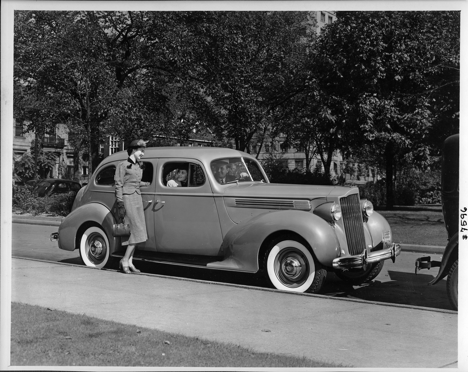 Packard Co. file photograph of a 1939 Packard nine-tenths right side view, parked on street, couple in front seat, female standing at front passenger door. Inscribed on photo back: "Packard one twenty, seventeenth series, model 1701, 8-cylinder, 120-horsepower, 127-inch wheelbase, 4-door, 5-person touring sedan (body type #1292), prototype, note non-production direction/point of windshield wiper blades in "off" setting, as shown, blades point outward to windshield "A" posts a la sixteenth series, whereas seventeenth series production blades point to center windshield vertical divider, non-production sixteenth series tail lamp reflector, 1938 Michigan license plate #U6555, dual white sidewall tires."