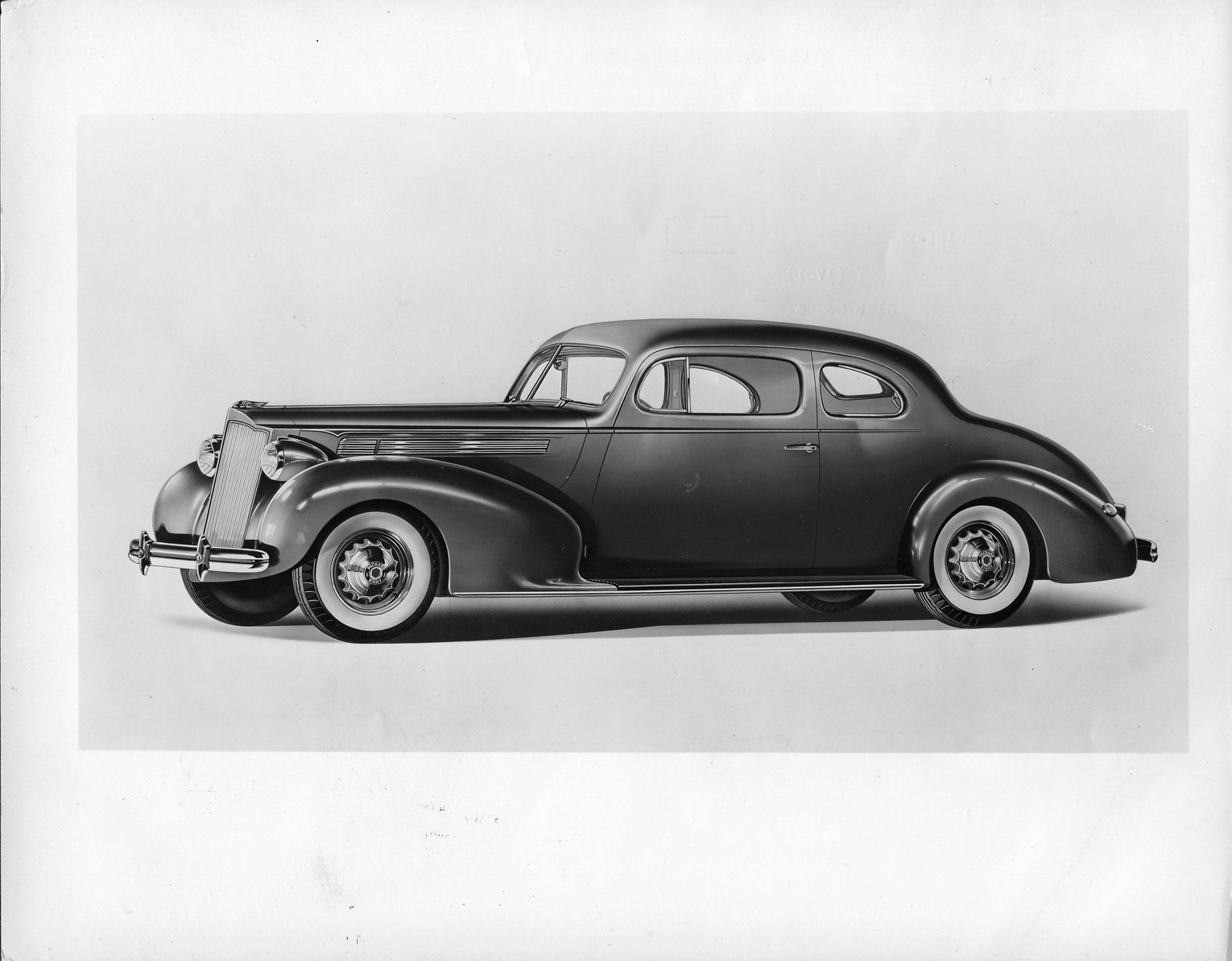 Packard Co. file photograph of a 1939 Packard nine-tenths left side view. Inscribed on photo back: "Packard one twenty, seventeenth series, model 1701 (produced 9/20/1938-8/8/1939), 8-cylinder, 120-horsepower, 127-inch wheelbase, 2/4-person club coupe (body type #1295), note "off" setting, as shown, blades point outward to windshield "A" posts a la sixteenth series, steel auxiliary wheels, dual white sidewall tires."
