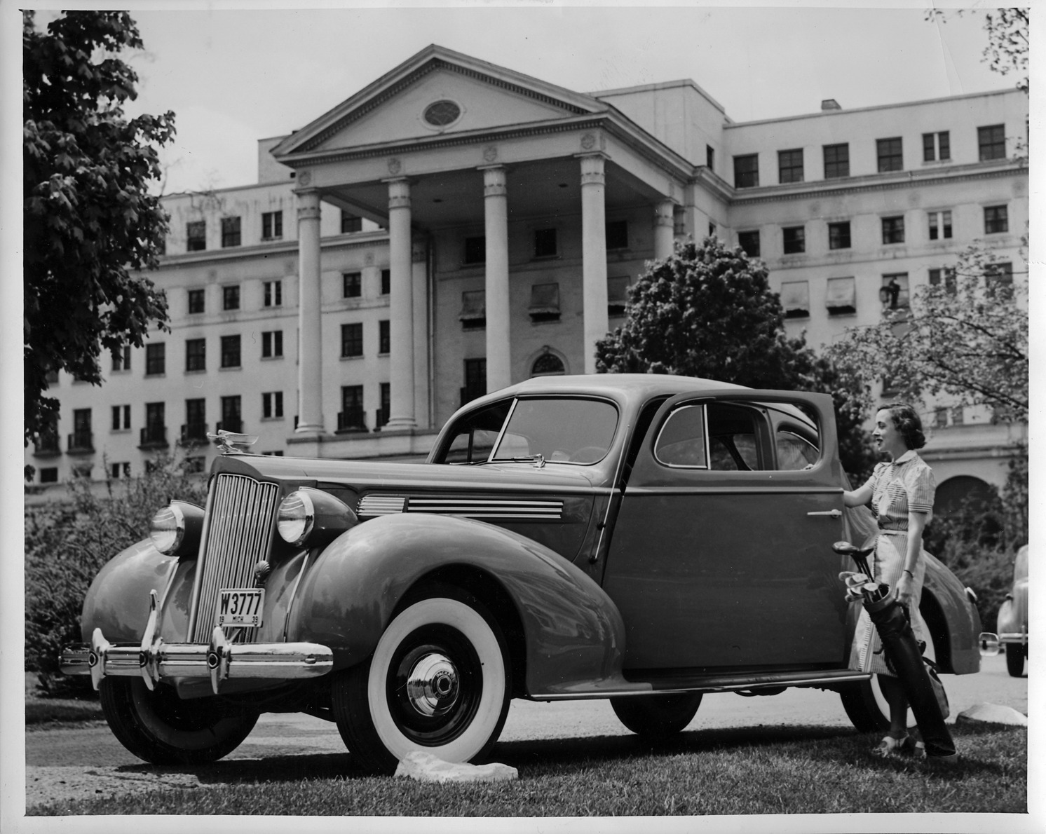 Packard Co. file photograph of a 1939 Packard three-quarter left front view, female standing at driver's door with set of golf clubs, large building in background. Inscribed on photo back: "Packard one twenty, seventeenth series, model 1701, 8-cylinder, 120-horsepower, 127-inch wheelbase, 2/4-person club coupe (body type #1295), note Packard deluxe emblem, deluxe steering wheel, dual white sidewall tires, center bumper guard, radio aerial mounted on cowl side panel, 1939 Michigan license plate #W-3777, setting: The Greenbrier, White Sulfur Springs, W.Va."
