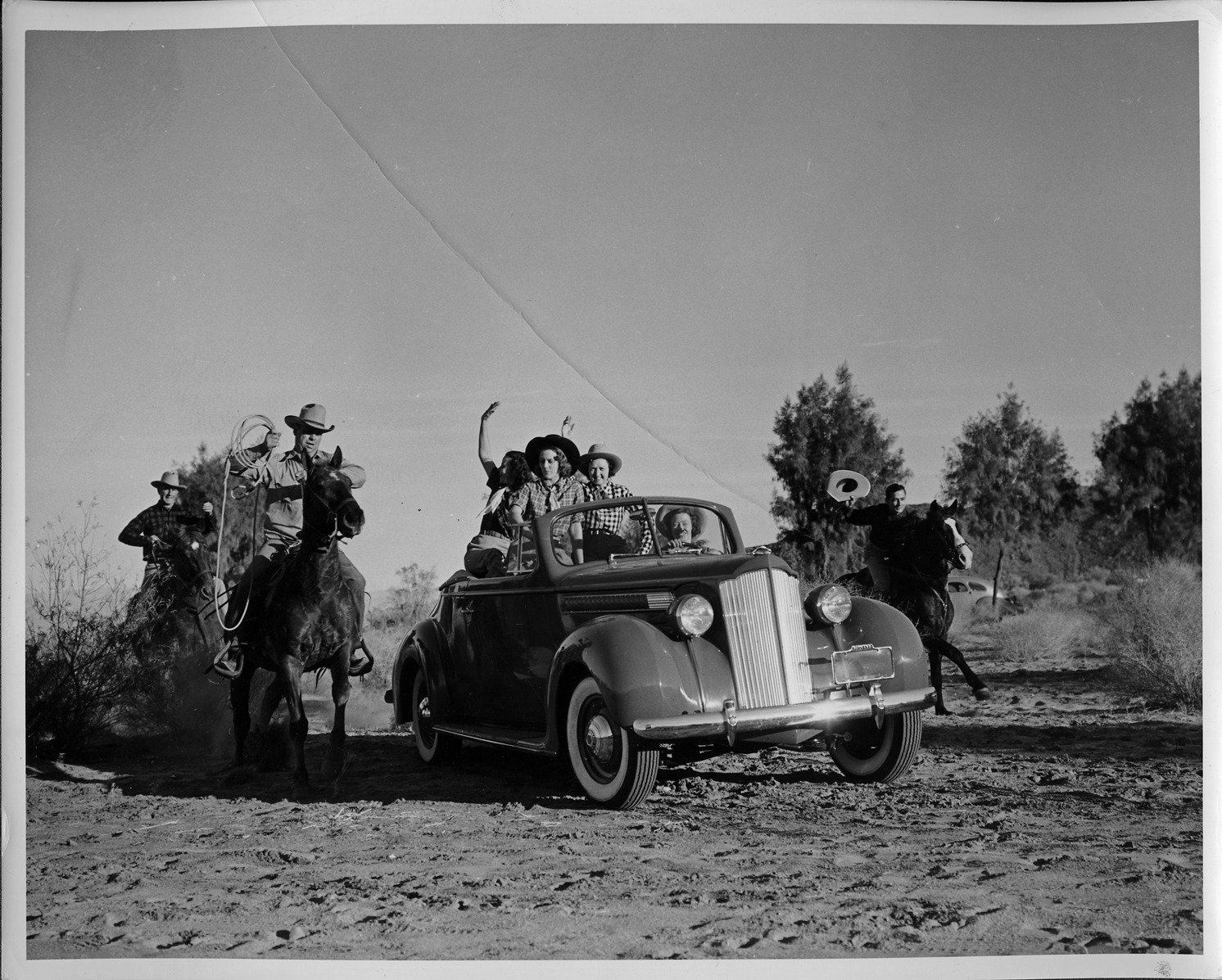 1939 Packard convertible coupe with cowgirls, three cowboys on horseback approaching