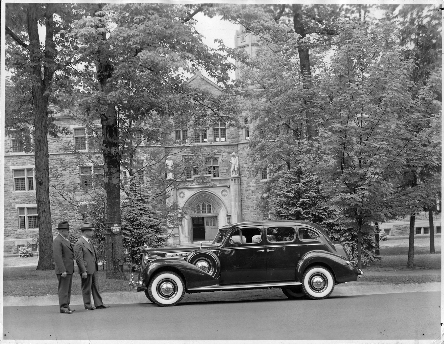 1939 Packard touring sedan, parked at Lehigh University in front of Packard building