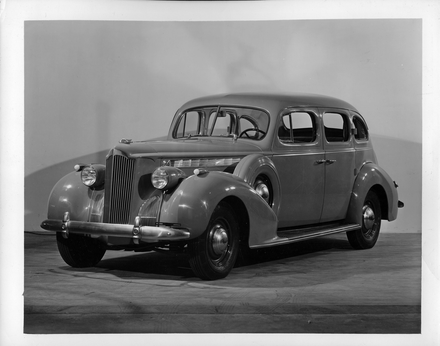Packard Co. file photograph of a 1940 Packard three-quarter front view. Inscribed on photo back: "Packard one twenty, eighteenth series, model 1801, 8-cylinder, 120-horsepower, 127-inch wheelbase, 4-door, 5-person touring sedan (body type #1392), optional equipment; fitted with six wheel equipment, prototype, non-production features; earlier series side mount cover with exposed wheel & hub cap, absent stamping around at side window, early production features; hub caps, tapered bumper ends, hood louver panel medallion."