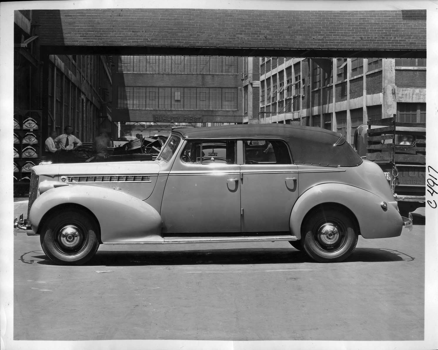 Packard Co. file photograph of a 1940 Packard left side view, top raised. Inscribed on photo back: "Packard one twenty, eighteenth series, model 1801, 8-cylinder, 120-horsepower, 127-inch wheelbase, 5-person convertible sedan (body type #1397), prototype, early 18th series production features; tapered bumper ends, louver panel medallion, non-production features; earlier series "eight" hub caps, note 1939 Michigan manufacturer license plate #26, setting: P.M.C. Co. yard, Detroit, Mich."