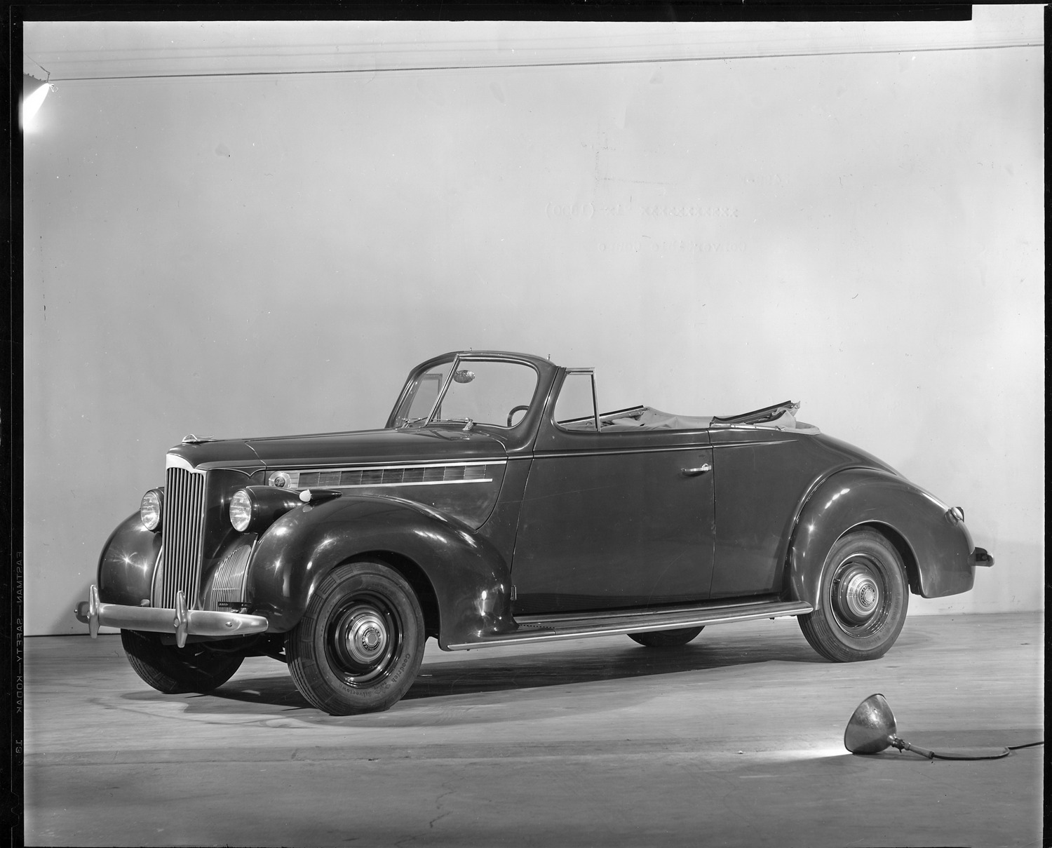 Packard Co. file photograph of a 1940 Packard nine-tenths left side view, top folded. Inscribed on photo back: "Packard one ten, eighteenth series, model 1800, 6-cylinder, 100-horsepower, 122-inch wheelbase, 2/4-person convertible coupe (body type #1389), prototype, note A) non-production; sixteenth series exterior door handle, hub caps, belt-line chrome trim which ends at aft edge of hood side panel, B) early 18th series production; bumper with tapered ends, hood side medallion with Packard."