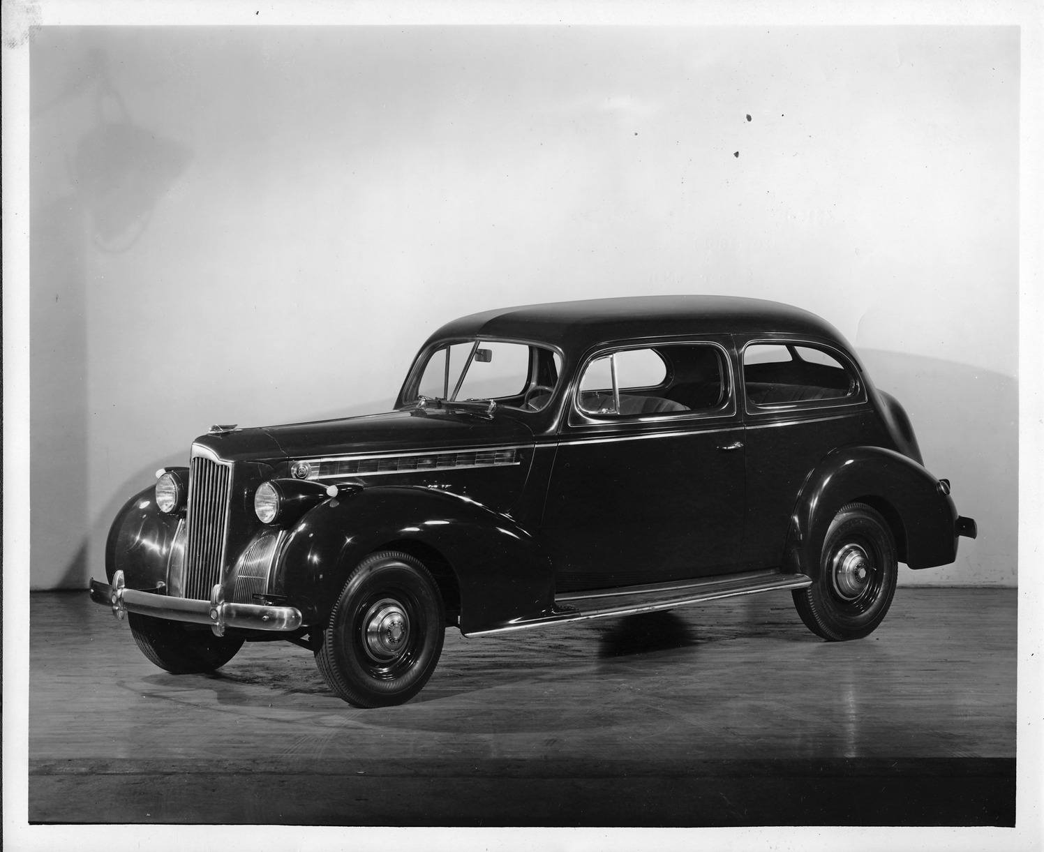 Packard Co. file photograph of a 1940 Packard three-quarter left side view. Inscribed on photo back: "Packard one twenty, eighteenth series, model 1801, 8-cylinder, 120-horsepower, 127-inch wheelbase, 2-door, 5-person family sedan (body type #1394), mid-season 18th series production, note mid-season features; rounded bumper ends, "Packard 110" on hub caps, "110" in hood louver medallion."