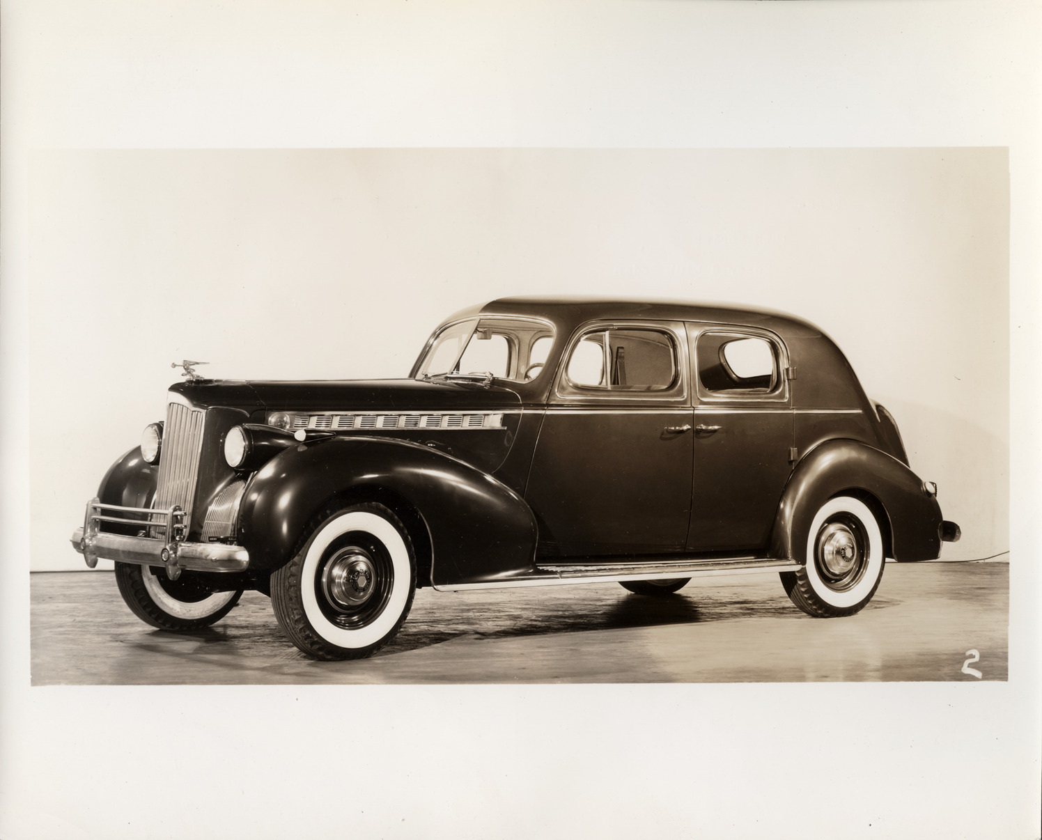 Packard Co. file photograph of a 1940 Packard three-quarter left side view. Inscribed on photo back: "Packard one sixty, super eight, eighteenth series, model 1803, 8-cylinder, 160-horsepower, 127-inch wheelbase, 5-person club sedan (body type #1376), mid-season 18th series production, note A) mid-season features; hub caps, B) optional equipment; dual white sidewall tires."