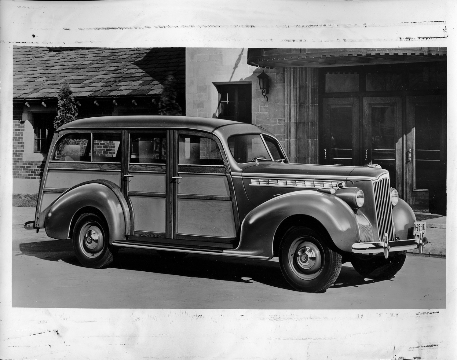 Packard Co. file photograph of a 1940 Packard seven-eights right side view. Inscribed on photo back: "Packard one ten, eighteenth series, model 1800, 6-cylinder, 100-horsepower, 122-inch wheelbase, 8-person station wagon (body type #1383), built by Hercules Body Co. Evansville, Ind., early 18th series production retouched to suggest some mid-season changes, note traditional style "120" hub caps, rounded bumper ends, 9-vent louver panel' medallion unaltered (remains early production style), 1939 Michigan license plate #V-26-17."
