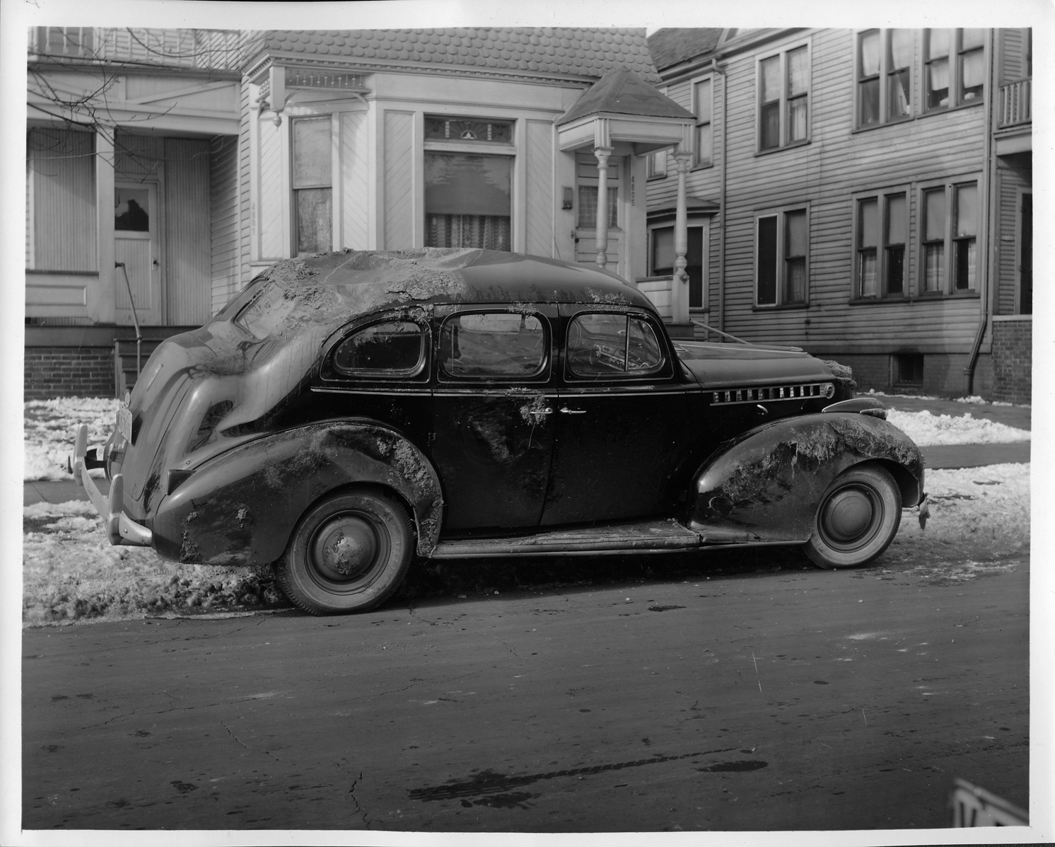 Packard Co. file photograph of a 1940 Packard seven-eights right rear view, parked on street, covered in mud. Inscribed on photo back: "Packard one twenty, eighteenth series, model 1801, (produced 8/8/39-9/15/40), 8-cylinder, 120-horsepower, 127-inch wheelbase, 4-door, 5-person touring sedan (body type #1392), early 18th series production, note: early production features; tapered bumper ends, hub caps, louver panel medallion, B) Packard approved accessories; (radiator) grille guard, radio, chrome wheel discs & chrome wheel trim rings, C) optional equipment; white sidewall tires, D) 1940 Michigan license plate #AK-71-16, following a crash."