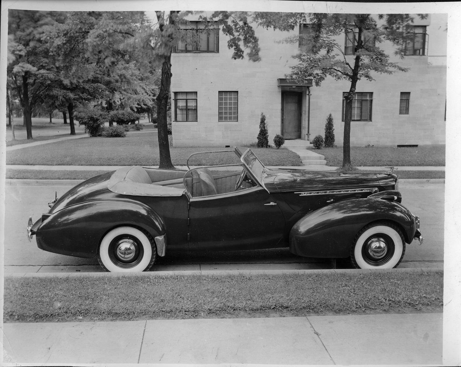 Packard Co. file photograph of a 1940 Packard right side view, top folded, parked on street. Inscribed on photo back: "Packard eight one eighty, super custom, eighteenth series, model 1806, 8-cylinder, 160-horsepower, 127-inch wheelbase, 7-person convertible victoria (body style #700), by Darrin, note early type production hub caps (in used prior to introduction of mid-season changes), Packard approved accessories; deluxe emblem, optional equipment; white sidewall tires."