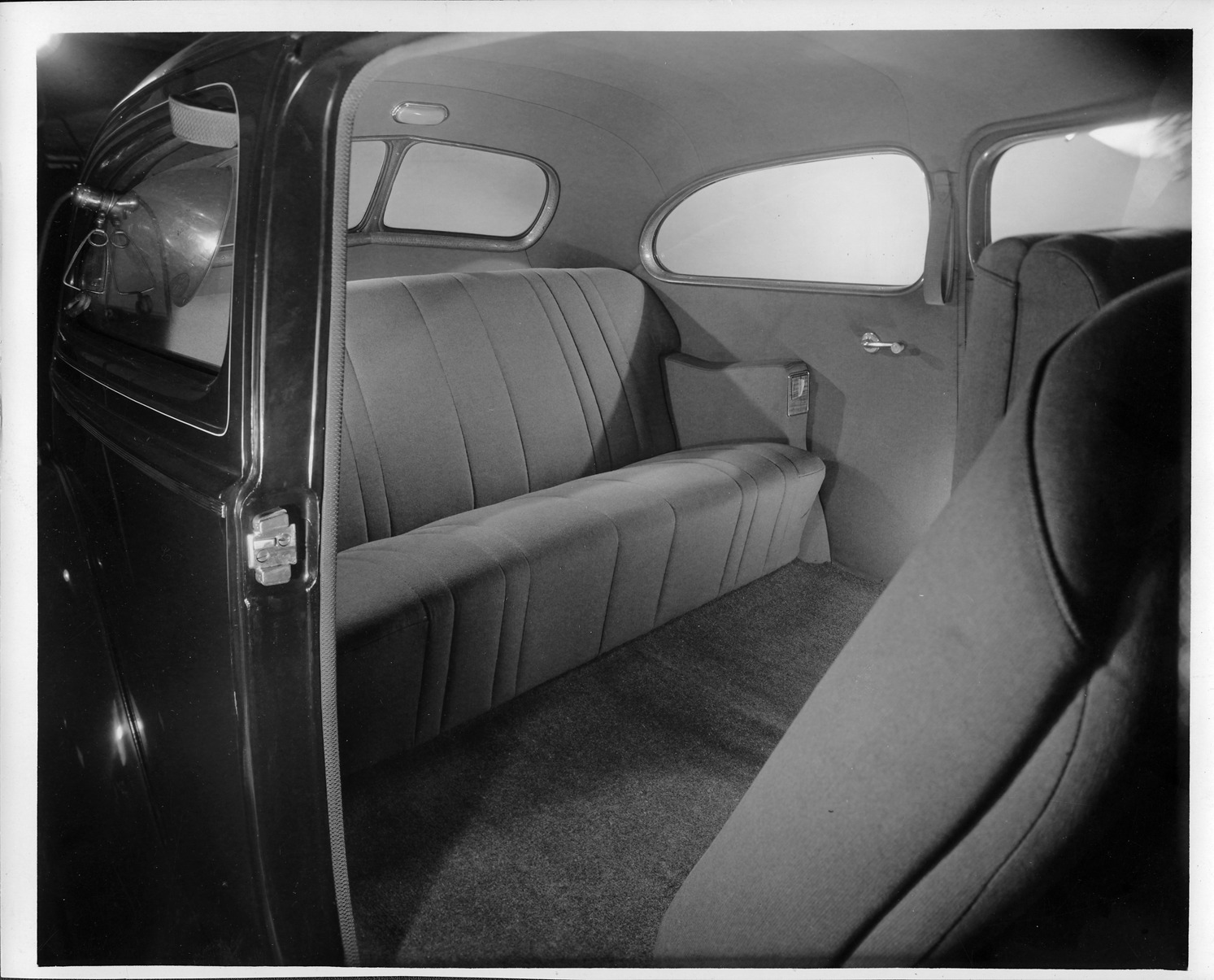 Packard Co. file photograph of a 1940 Packard view of rear interior through passenger side door. Inscribed on photo back: "Packard one twenty, eighteenth series, model 1801, 8-cylinder, 120-horsepower, 127-inch wheelbase, 2-door, 5-person family sedan (body type #1394), mid-season 18th series production, note mid-season features; light-colored plastic trim on hardware."