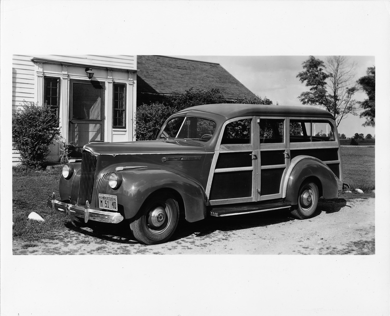 1941 Packard station wagon, three-quarter left side view, parked in driveway in front of house