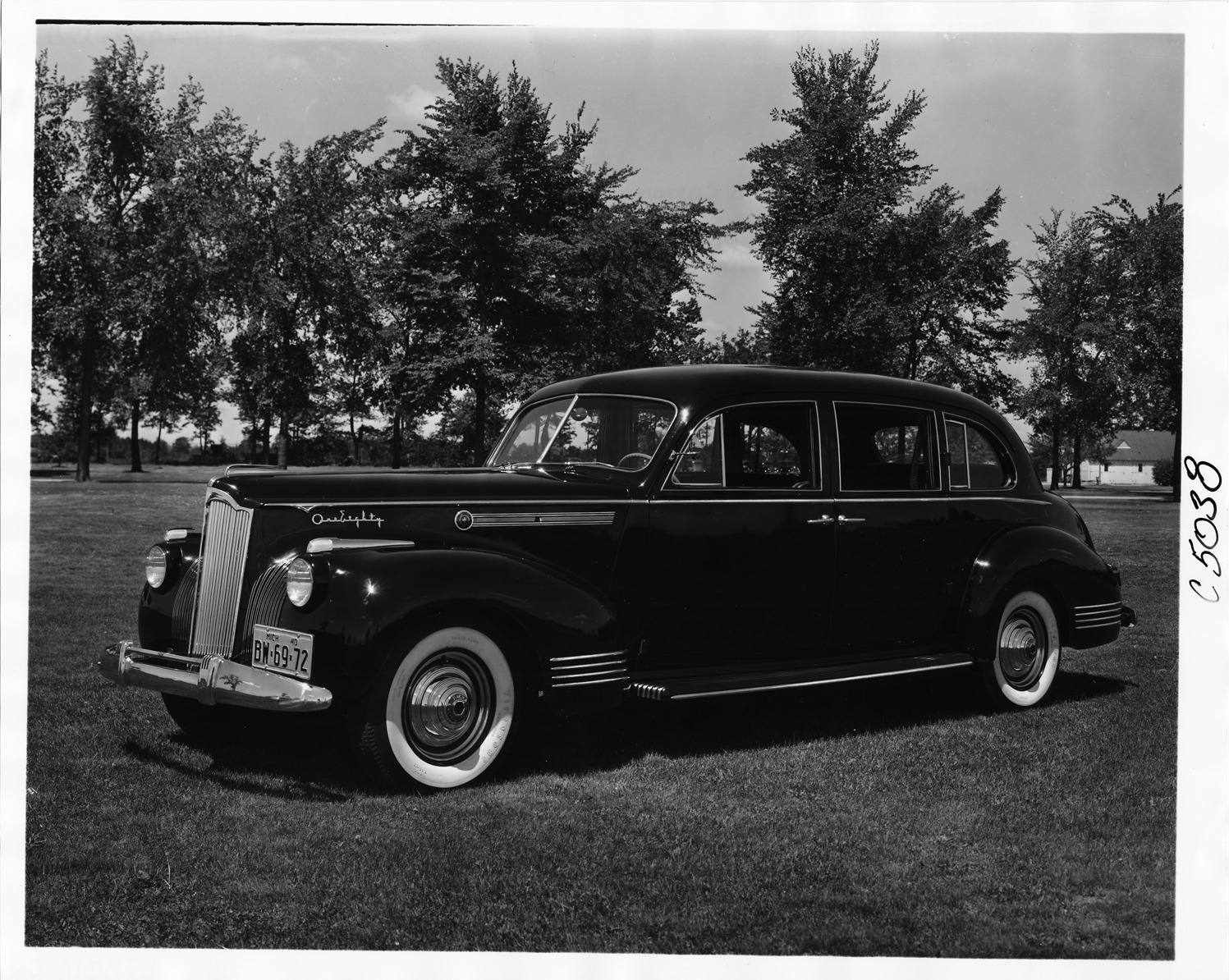 Packard Co. file photograph of a 1941 Packard three-quarter left side view, parked on grass. Inscribed on photo back: "Packard one eighty, custom super-8, nineteenth series, model 1908, 8-cylinder, 160-horsepower, 148-inch wheelbase, 7-person touring limousine (body type #1420), by LeBaron, 1940 Michigan license plate #BW-69-72."
