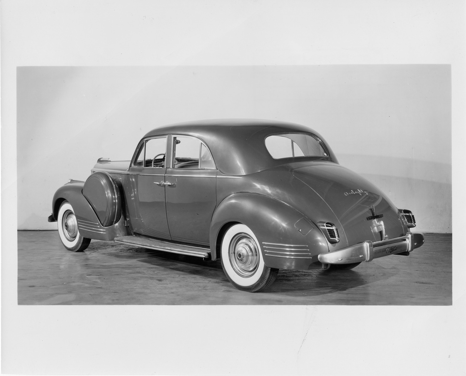 Packard Co. file photograph of a 1941 Packard three-quarter rear view. Inscribed on photo back: "Packard one eighty, custom super-8, nineteenth series, model 1907, 8-cylinder, 160-horsepower, 138-inch wheelbase, 5-person sport brougham (body type #1452), by LeBaron."