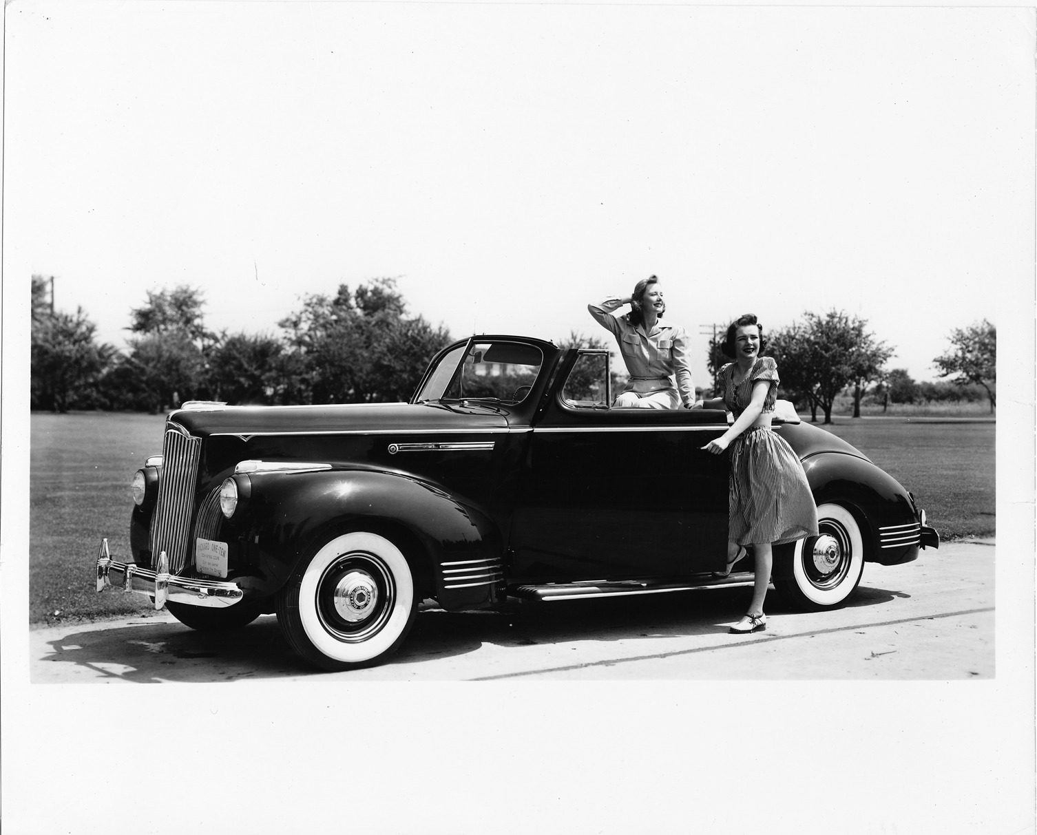 Favorite this☆ Women posing with 1941 Packard convertible Description: Packard Co. file photograph of a 1941 Packard seven-eights left side view, top folded, white sidewall tires, woman sitting in back, woman opening driver's door. Details Resource ID: EB01e208 Creator: Packard Motor Car Company Subject: Packard automobile Photographic prints Date Issued: 1941 Format: 1 photographic print ; 8 x 10 in. Member of: National Automotive History Collection Packard Collection Rights: Physical rights are retained by DPL. Copyright is retained in accordance with U.S. copyright laws.