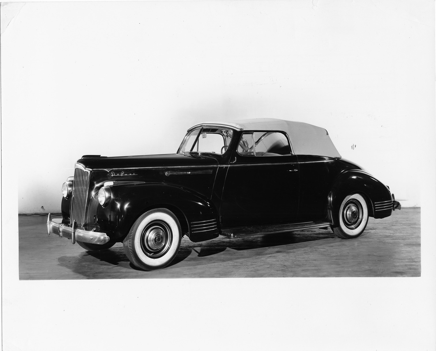 Packard Co. file photograph of a 1941 Packard seven-eights left side view, top raised. Inscribed on photo back: "Packard one ten, nineteenth series, model 1900, 6-cylinder, 100-horsepower, 122-inch wheelbase, 5-person deluxe convertible coupe (body type #1489DE), late production 19th series; "Deluxe" script on hood side panel, deluxe steering wheel, 4 chrome trim spears on each fender, chrome wheel trim rings, chrome headlamp rings, white sidewall tires, optional full running board (sans stone guard)."
