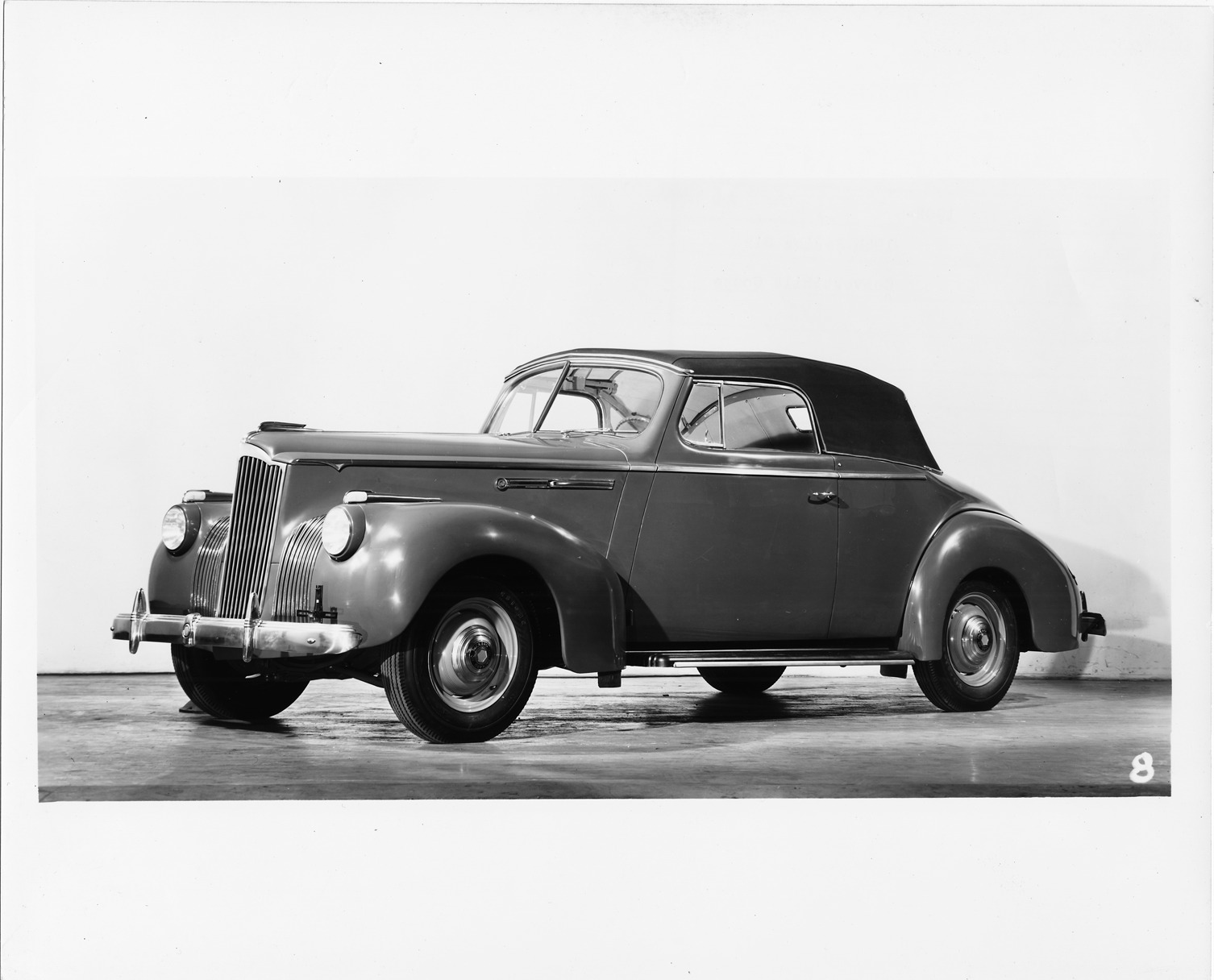 Packard Co. file photograph of a 1941 Packard seven-eights left side view, top raised. Inscribed on photo back: "Packard one ten, nineteenth series, model 1900, 6-cylinder, 100-horsepower, 122-inch wheelbase, 5-person convertible coupe (body type #1489), prototype."