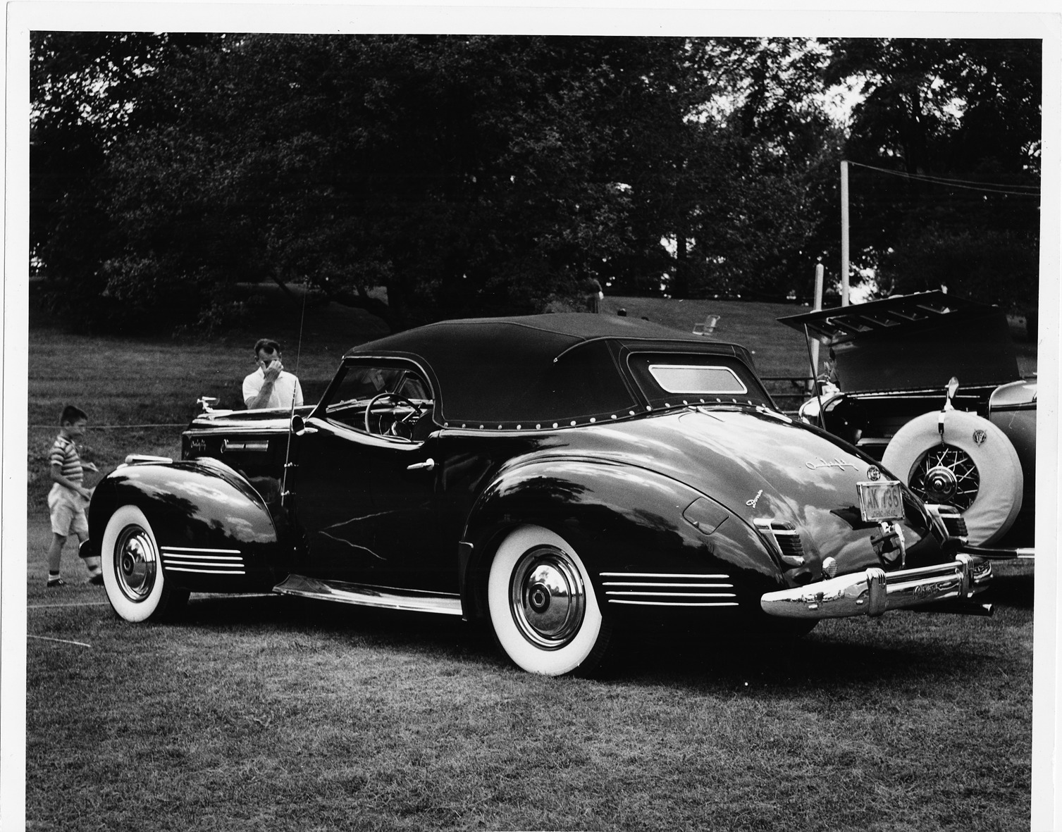 1942 Packard convertible victoria, three-quarter rear view, top raised, parked on grass
