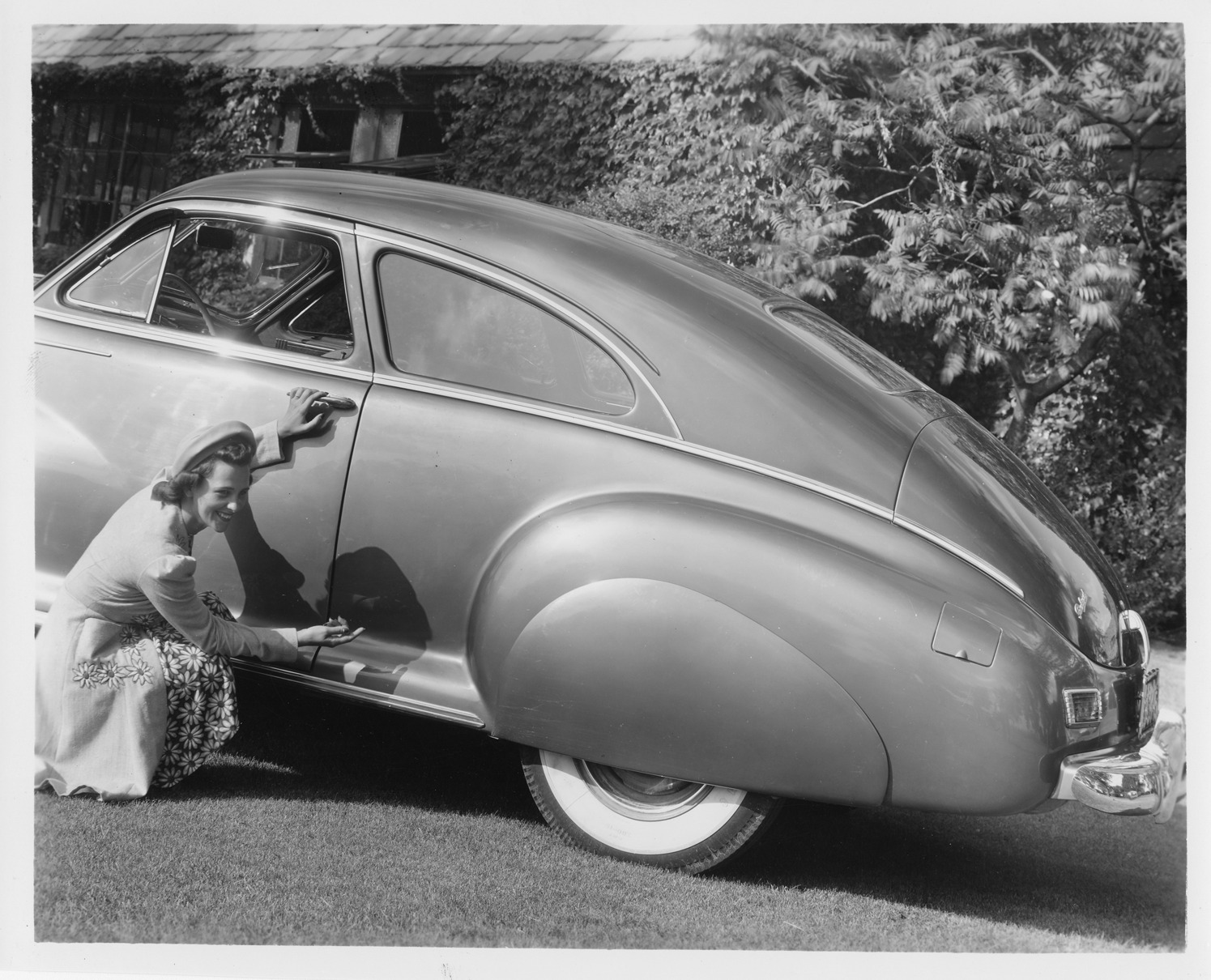 Favorite this☆ Woman posing with 1942 Packard club sedan Description: Packard Co. file photograph of 1942 Packard view of rear three-quarters of car, woman stooping to gesture at car. Inscribed on photo back: "1942 Packard Clipper, custom 160, model 2003, club sedan." Details Resource ID: EB01e238 Creator: Packard Motor Car Company Subject: Packard automobile Photographic prints Date Issued: 1942 Format: 1 photographic print ; 8 x 10 in. Member of: National Automotive History Collection Packard Collection Rights: Physical rights are retained by DPL. Copyright is retained in accordance with U.S. copyright laws.