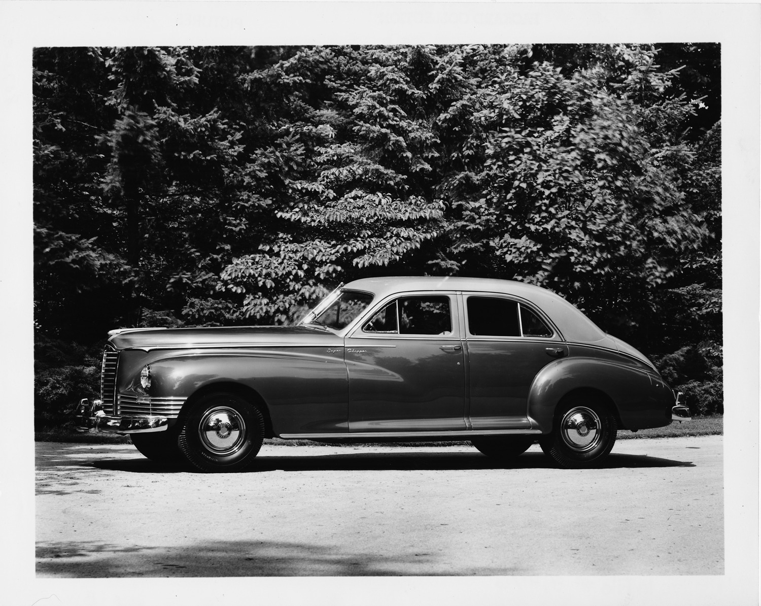 Favorite this☆ 1946 Packard Clipper sedan, left side view, parked on road Description: Packard Co. file photograph of a 1946 Packard left side view, parked on road. Inscribed on photo back: "1946 Packard Super Clipper touring sedan, 127-inch wheelbase." Details Resource ID: EB01e257 Creator: Packard Motor Car Company Subject: Packard automobile Photographic prints Date Issued: 1946 Format: 1 photographic print ; 8 x 10 in. Member of: National Automotive History Collection Packard Collection Rights: Physical rights are retained by DPL. Copyright is retained in accordance with U.S. copyright laws.