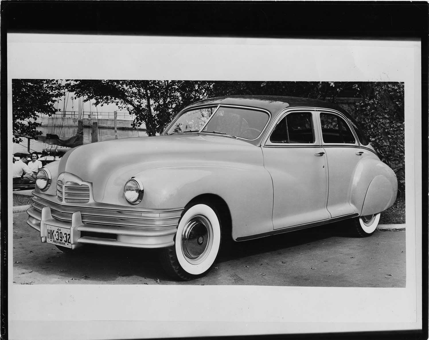 Packard Co. file photograph of a 1946 Packard three-quarter left front view. Inscribed on photo back: "Packard archives indicate facelift for Clipper was originally planned for twenty-first series, by 1942 the heavier front end and hidden headlights had appeared on a front-end-only facelift, this evolved to a more streamlined hood with hidden headlamps by 1944, in 1945 artists retouched a photo of a production 1942 Clipper, using the proposed new lines, around the same time the more elaborate custom eight grille work was emerging, finally came the production prototypes, with completely altered fuselage and flow-through fenders."