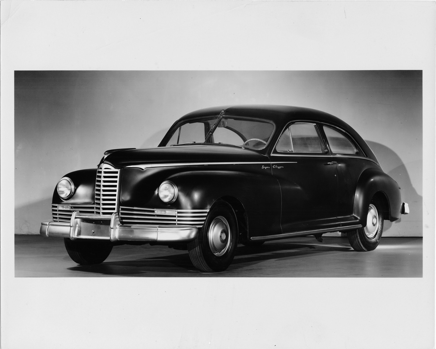 Favorite this☆ 1946 Packard Super Clipper, three-quarter left front view Description: Packard Co. file photograph of a 1946 Packard three-quarter left front view. Inscribed on photo back: "1946 Packard super eight, 2-door." Details Resource ID: EB01e259 Creator: Packard Motor Car Company Subject: Packard automobile Photographic prints Date Issued: 1946 Format: 1 photographic print ; 8 x 10 in. Member of: National Automotive History Collection Packard Collection Rights: Physical rights are retained by DPL. Copyright is retained in accordance with U.S. copyright laws.