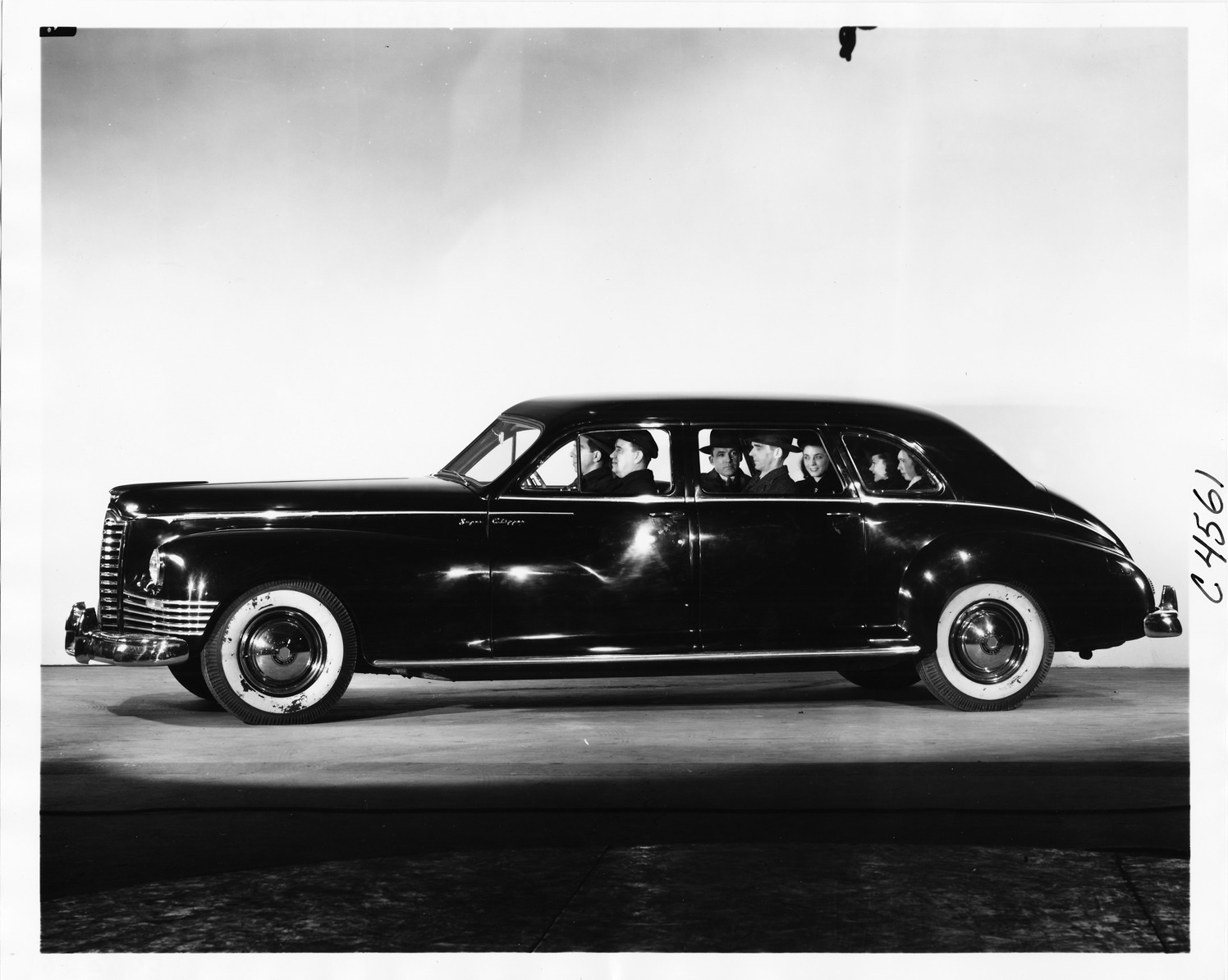 Packard Co. file photograph of a 1946 Packard left side view, three females and two men in back, two men in front seat. Inscribed on photo back: "1946 Packard custom Super Clipper limousine."