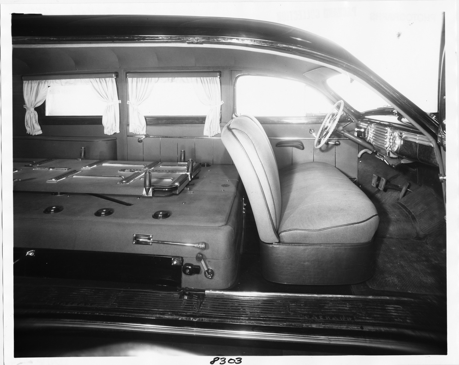 Packard Co. file photograph of a 1946 Packard view of interior from right side. Inscribed on photo back: "1946 Henney Packard funeral limousine."