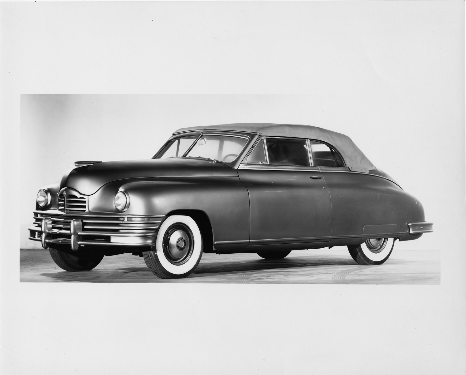 Favorite this☆ 1947 Packard convertible, top raised, dual white sidewall tires Description: Packard Co. file photograph of a 1947 Packard convertible, seven-eights left side view, top raised, dual white sidewall tires. Inscribed on photo back: "1947 Packard." Details Resource ID: EB01e282 Creator: Packard Motor Car Company Subject: Packard automobile Photographic prints Date Issued: 1947 Format: 1 photographic print ; 8 x 10 in. Member of: National Automotive History Collection Packard Collection Rights: Physical rights are retained by DPL. Copyright is retained in accordance with U.S. copyright laws.