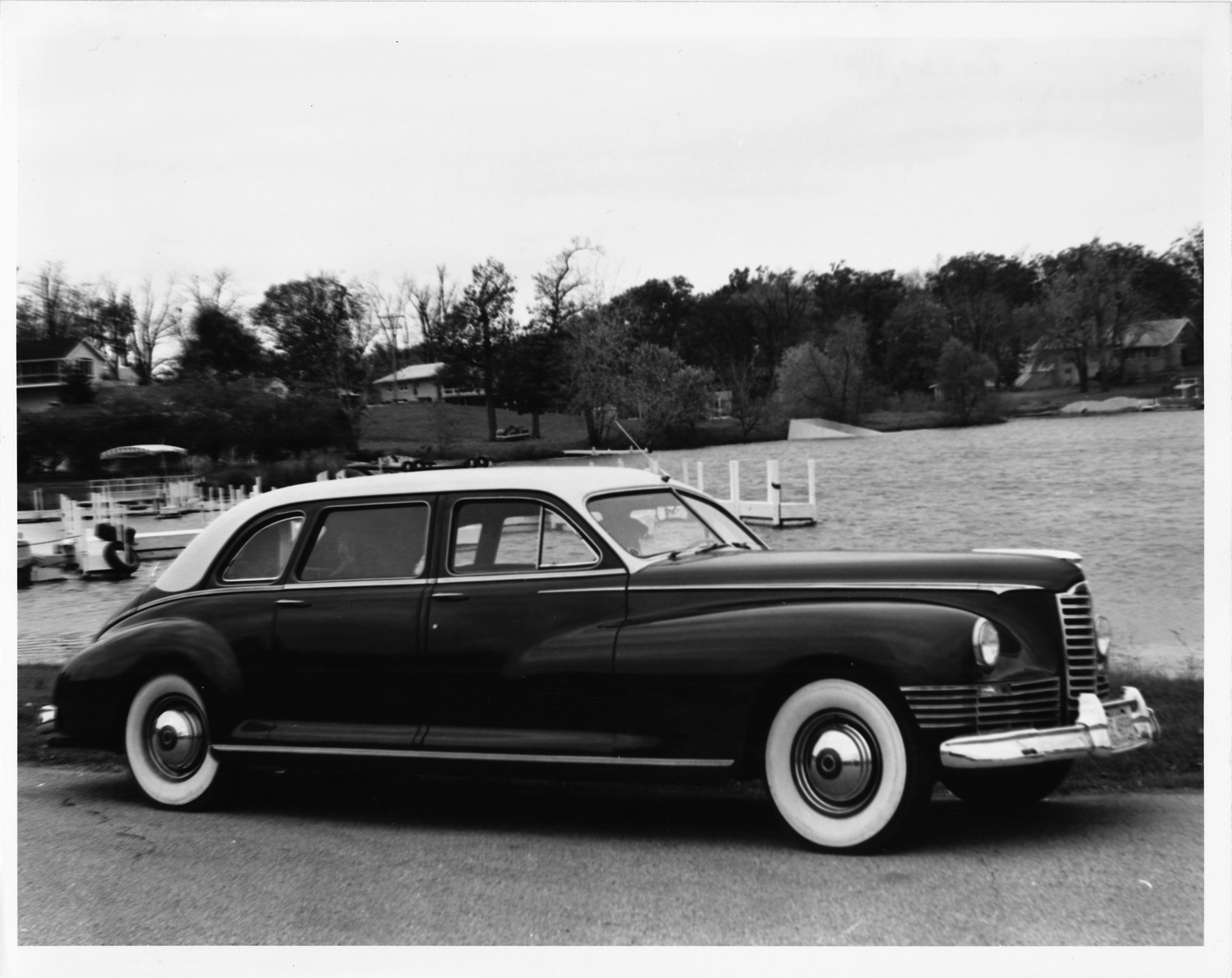 Packard Co. file photograph of a 1947 Packard right side view, dual white sidewall tires, parked on street, dock and lake in background. Inscribed on photo back: "1947 Packard model 2126, 9-person executive sedan, 148-inch wheelbase, manual shift, with overdrive."