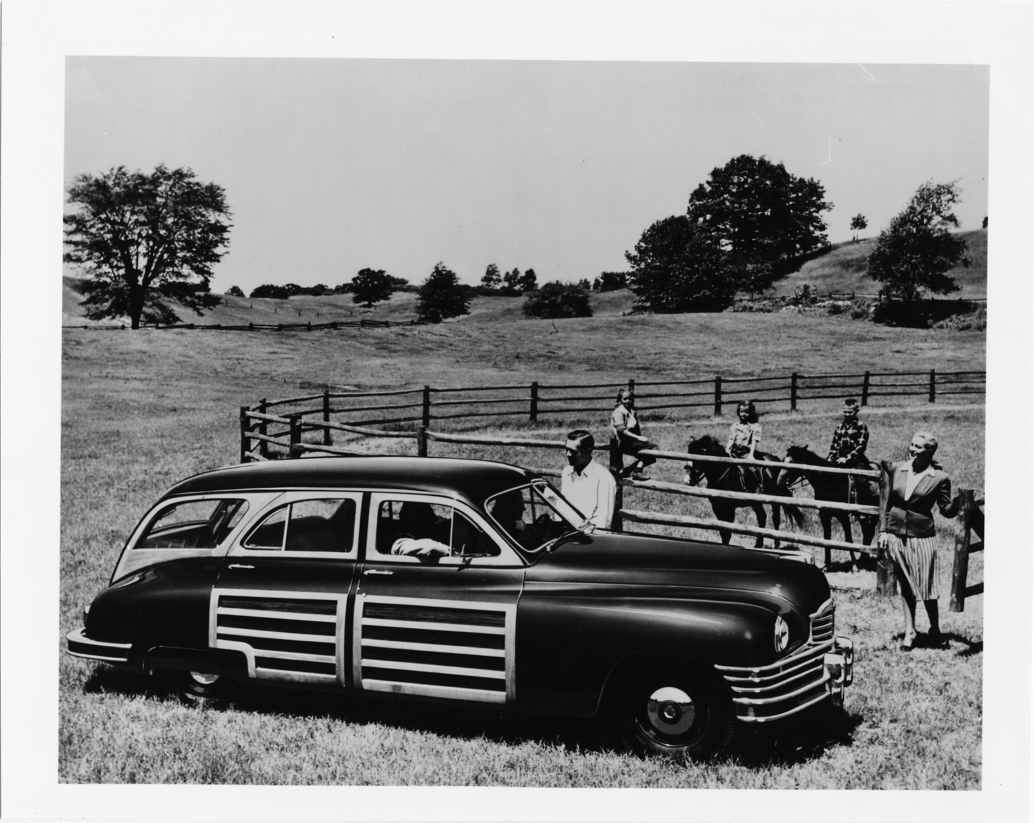 Packard Co. file photograph of a 1948 Packard nine-tenths right side view, female behind wheel, male passenger, parked in field near family with horses. Photo caption on back from Packard News Service: "The all new 1948 Packard station sedan, with new "free flow" styling and a new 130-horsepower straight eight engine, is the first such vehicle in the industry to have an all steel body and an all steel top, socially acceptable anywhere, as well as utilitarian, the station sedan has four doors and two full size seats of welded steel tube construction, fine grained hardwood decorates the exterior of the doors, window panels and tail-gate, Packard engineers say the station sedan is a free of rattles as any other closed car."